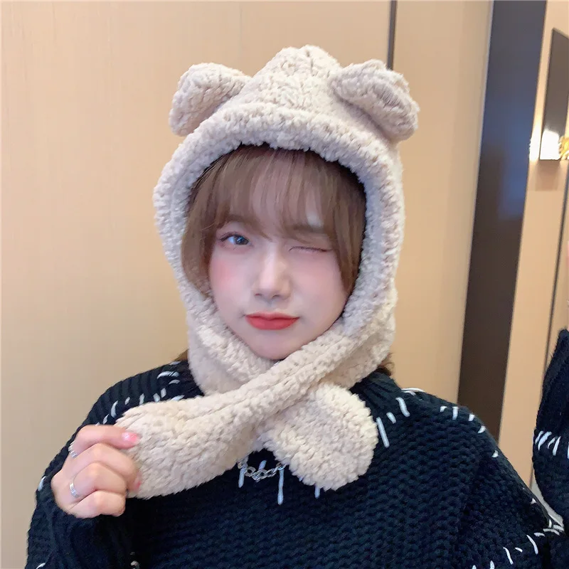 Зимняя Шапка-бини с мультяшным медведем, Балаклава с ушками, плюшевая Пушистая Шапка-ушанка для женщин, теплая утепленная ветрозащитная шапка-шарф, шапка