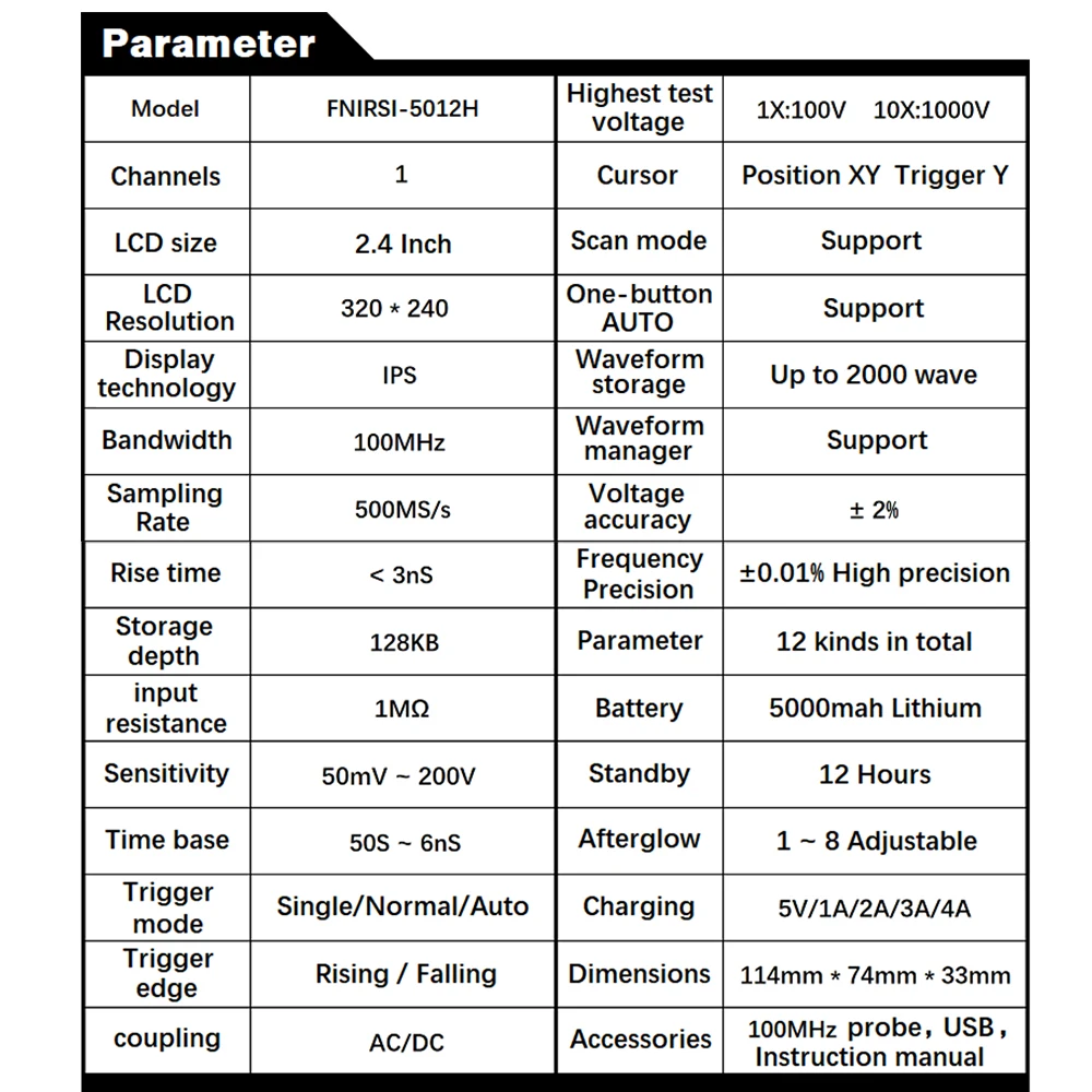 FNIRSI-5012H цифровой осциллограф 2,4 дюйма дисплей 500 мксс Частота выборки 100 МГц аналоговая полоса пропускания осциллограф для сохранения сигналов