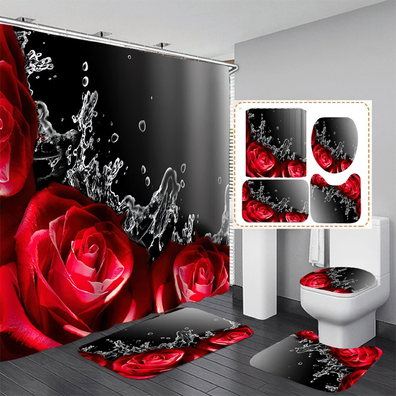 Набор водонепроницаемых штор для душа с красными розовыми цветами и...
