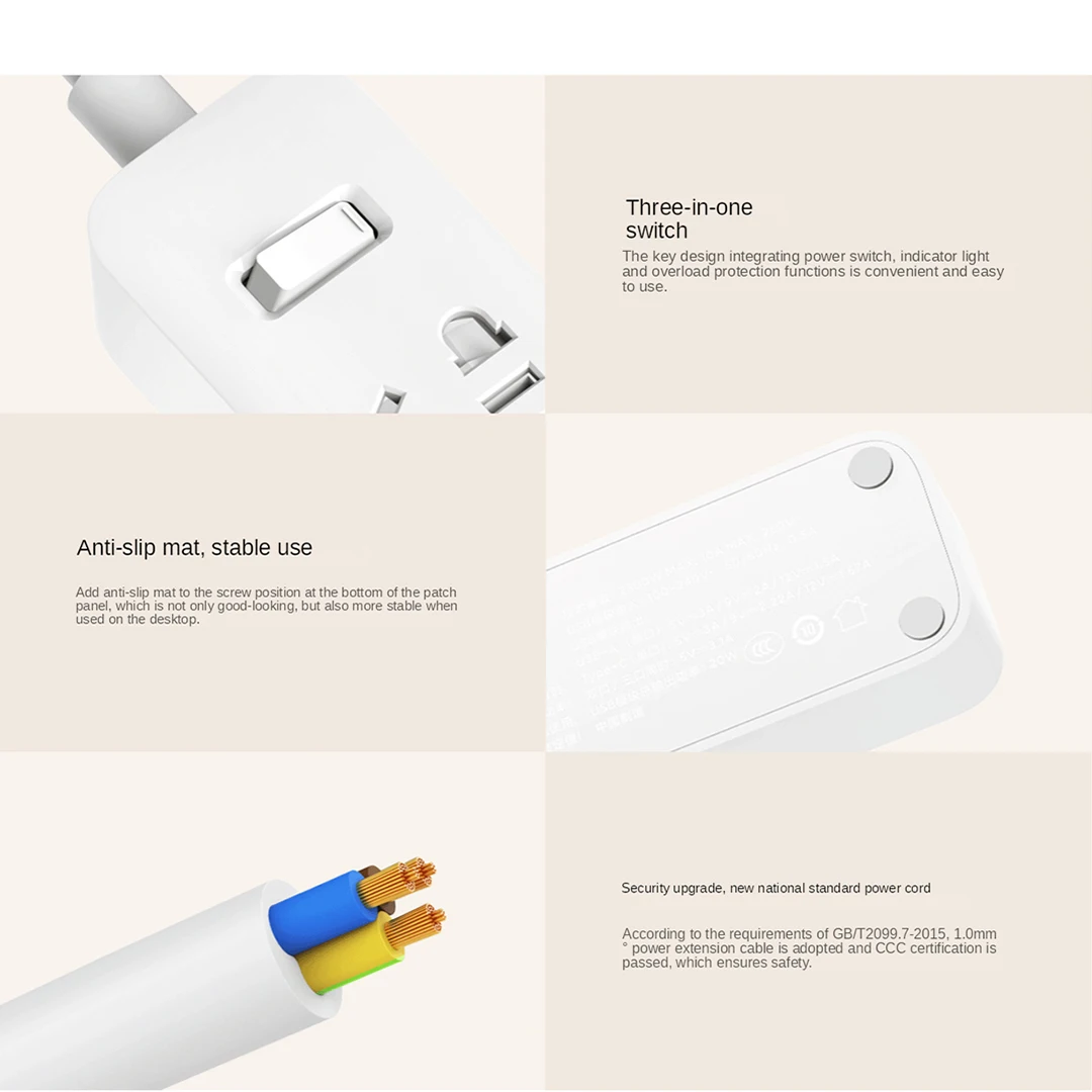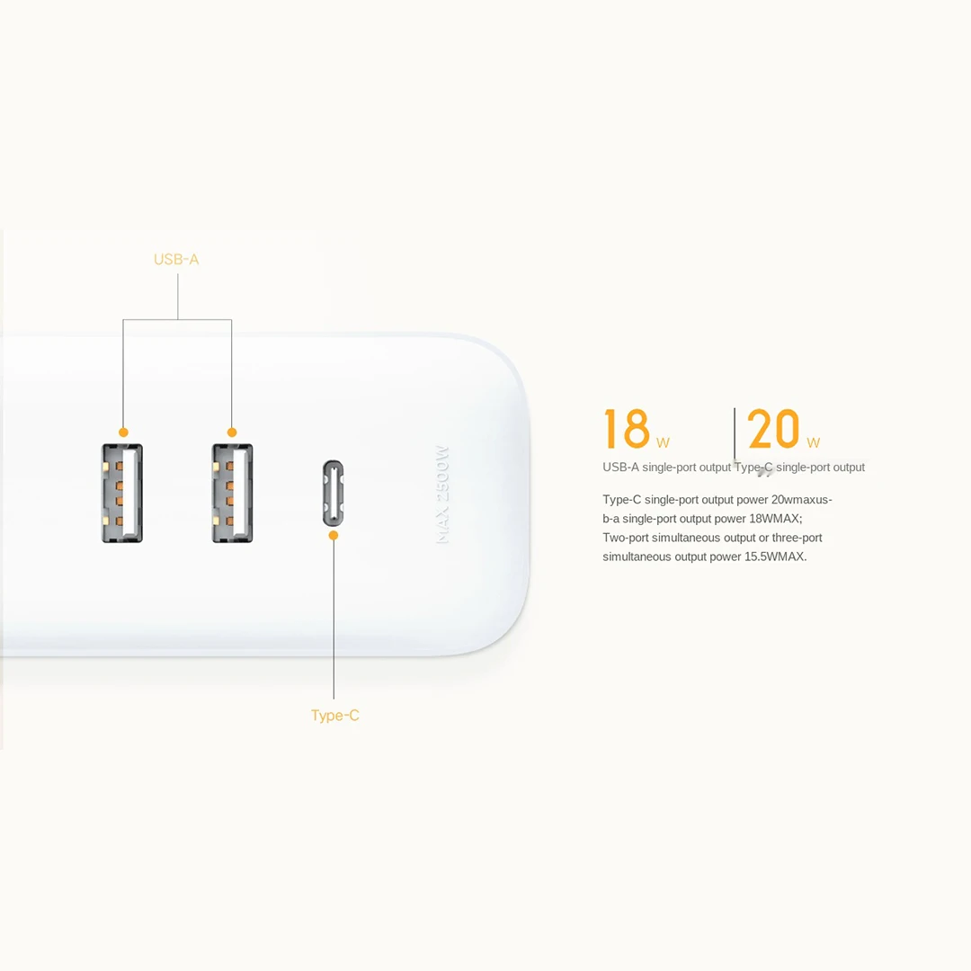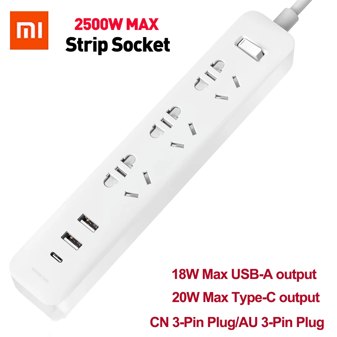 Оригинальный удлинитель питания XIAOMI 2500 Вт, 3 розетки, зарядное устройство USB, быстрая зарядка, 20 Вт, Type-C PD Power, 18 Вт, 2 порта USB, выходное зарядное устройство QC3.0