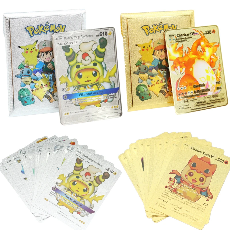 55 шт., металлические золотые карточки с покемоном, серебристые золотистые испанские черные игральные карты, металлические карточки, Charizard Vmax, серии Gx, игровой чехол с надписью