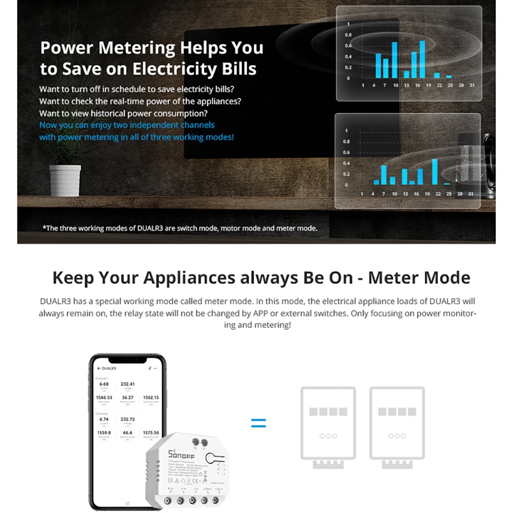 Двойное реле Sonoff DualR3, двухсторонний измеритель мощности, умный переключатель, мотор для рулонных штор, электрические шторы, пульт дистанционного управления