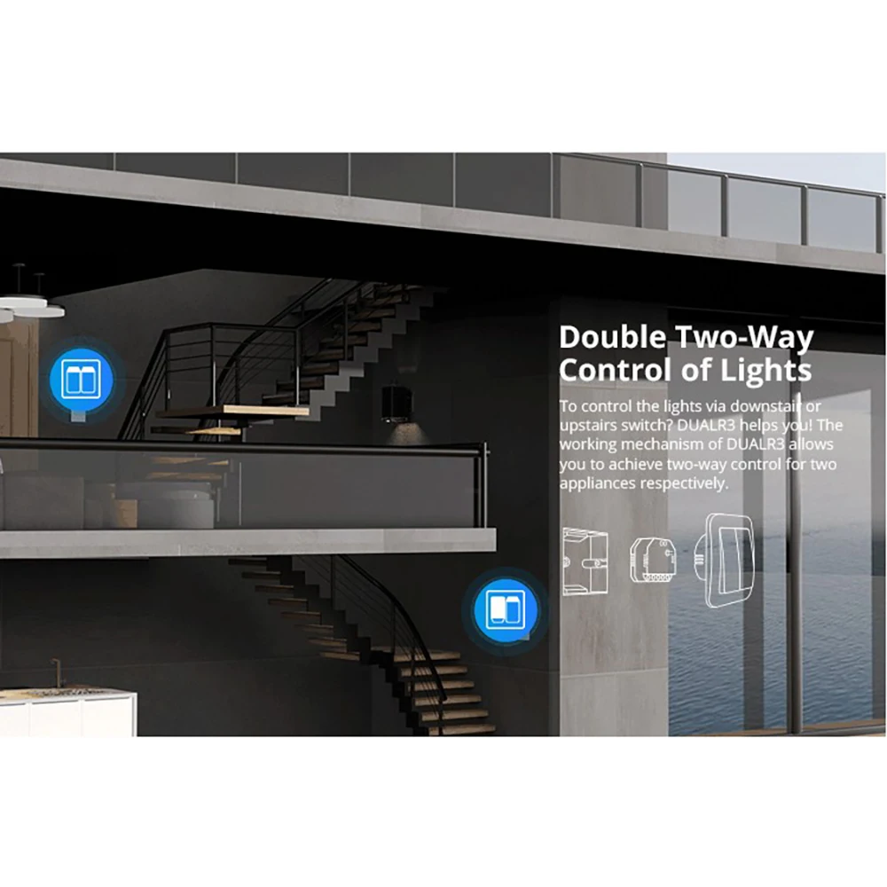 Для управления светом через лестницу или переключатель наверху? DUALR3 поможет вам! Рабочий механизм DUALR3 позволяет достичь двустороннего контроля для двух приборов соответственно.
