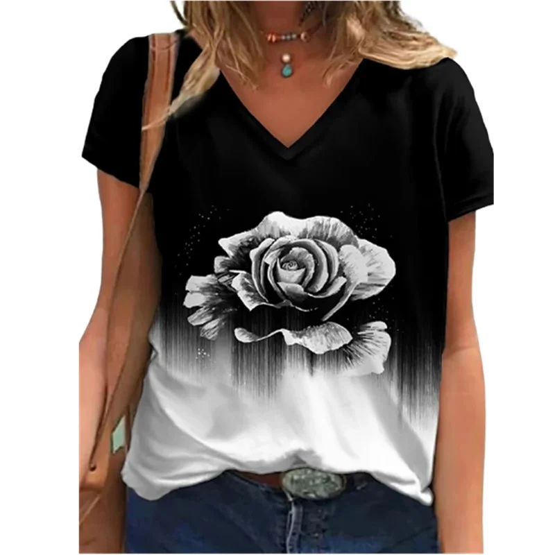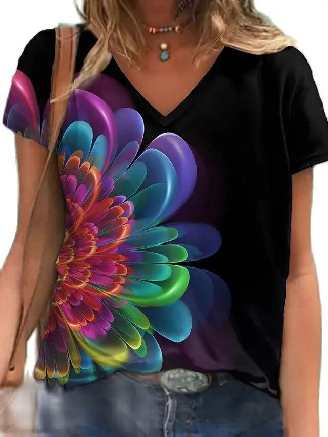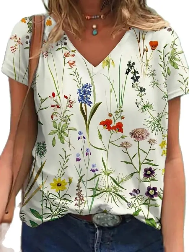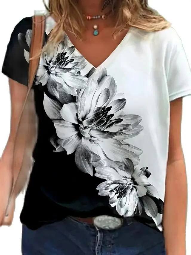 Женская футболка с коротким рукавом, V-образным вырезом и цветочным принтом