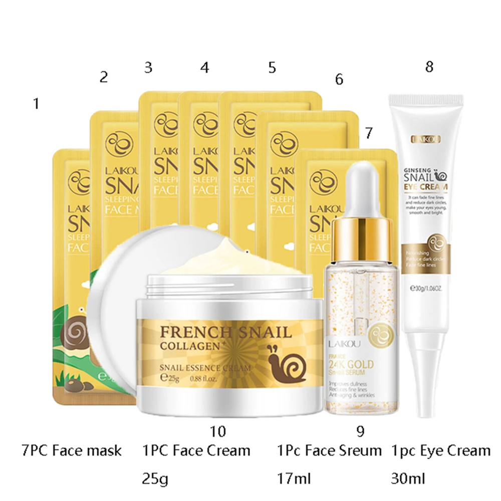 С улиточным коллагеном наборы для ухода за кожей богаты эссенцией улитки, гиалуроновой кислотой и экстрактом тремеллы. Он может увлажнить сухую кожу, восстановить поврежденную кожу и повысить эластичность кожи. Он может обдумывать проблемы кожи, такие как грубая кожа, тусклая кожа и тонкие линии. Длительное использование может смягчить молодость кожи. Он может выцветать тонкие линии и уменьшать темные круги, сделать ваши глаза молодыми и яркими.