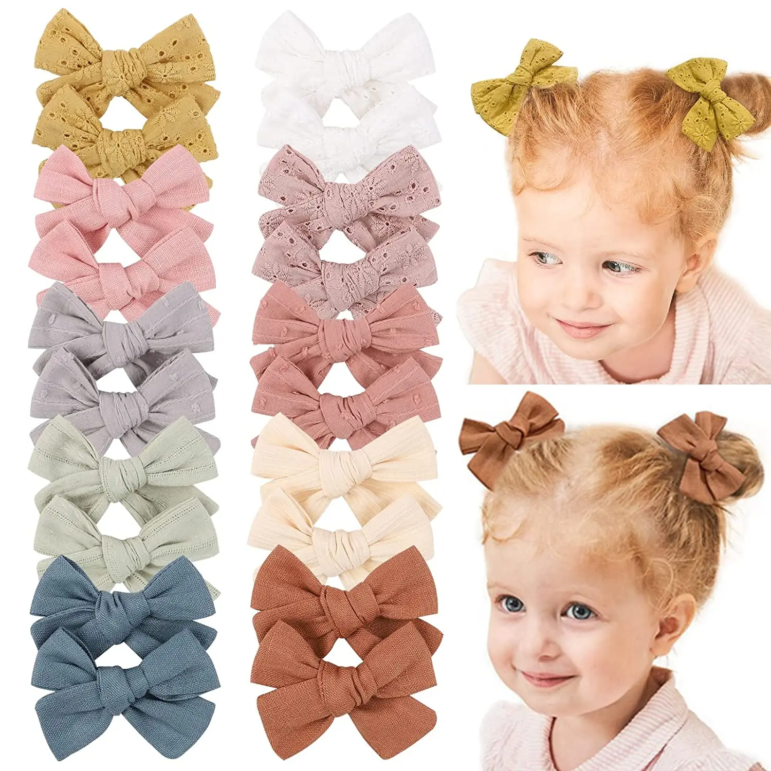 Посылка: содержит 20 (10 пар) 3,2 "бант для волос заколки, который может быть сопоставлены с любой милые комплекты для девочек нарядные юбки. Категории красивой заколки для девочек включают в себя полые цветочные банты, льняные бантики и однотонные полосатые банты.