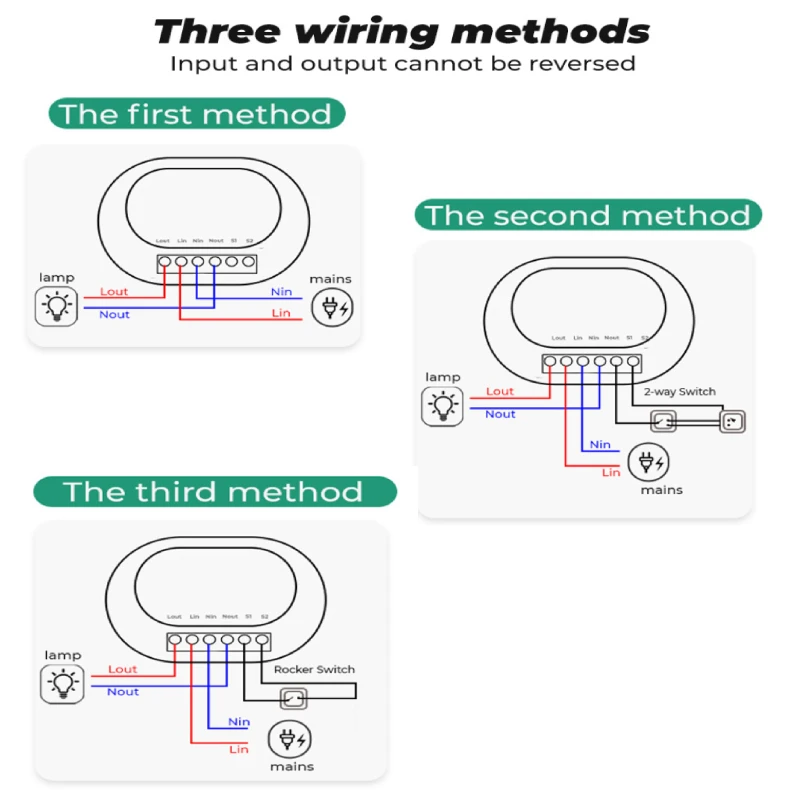 3 вида способов подключения, поддержка без переключателя, поддержка 1 позиционного переключателя, поддержка 2 позиционного переключателя. Может использоваться с механическим переключателем 2 способа перед подключением к дому