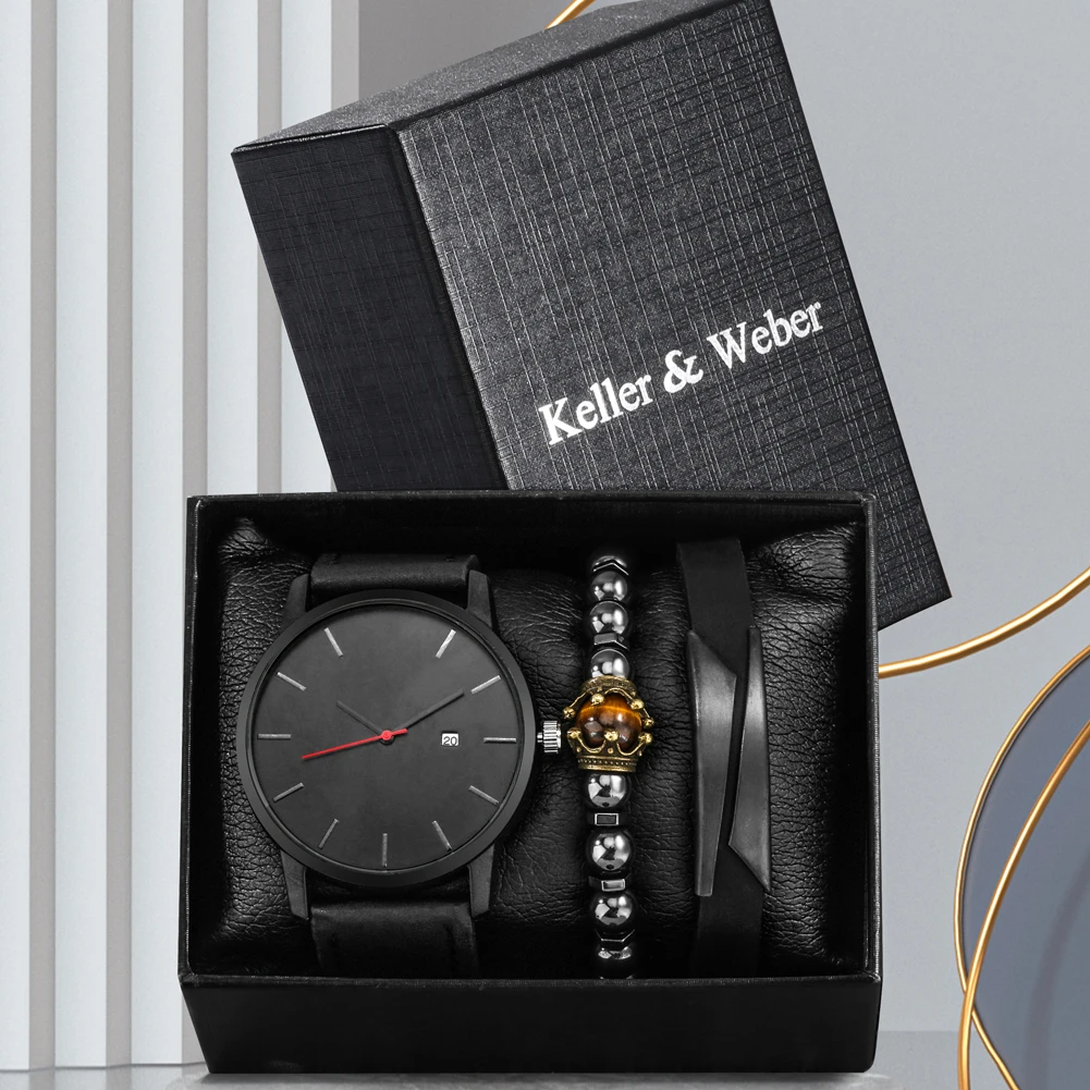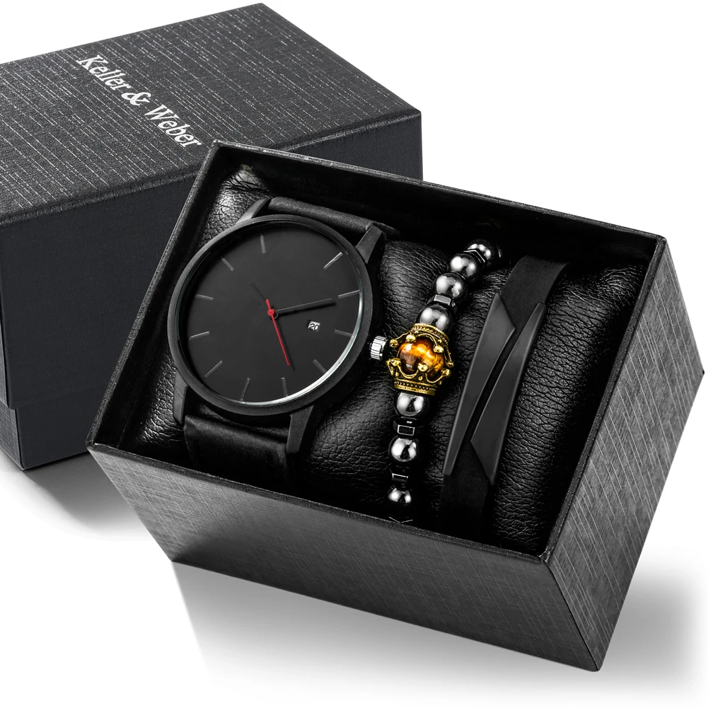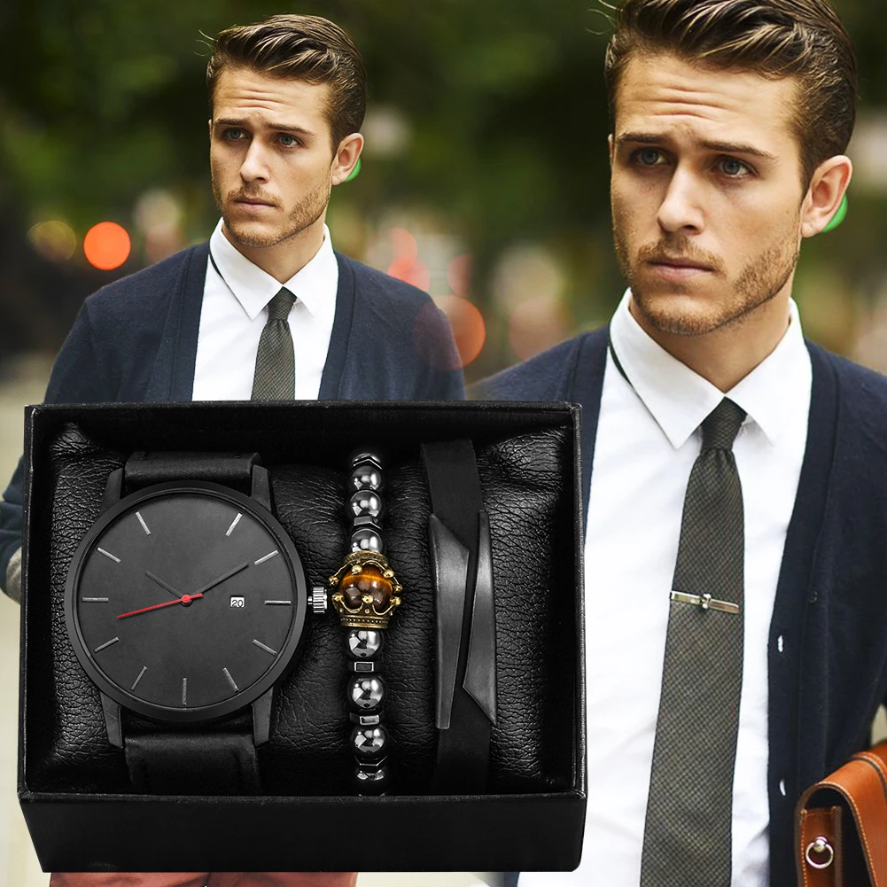 Часы наручные мужские кварцевые деловые, черный комплект с кожаным ремешком и браслетом с бусинами, с простым циферблатом и календарем, подарок для мужчин