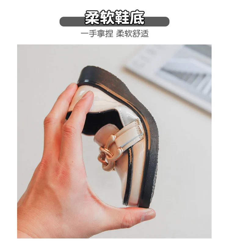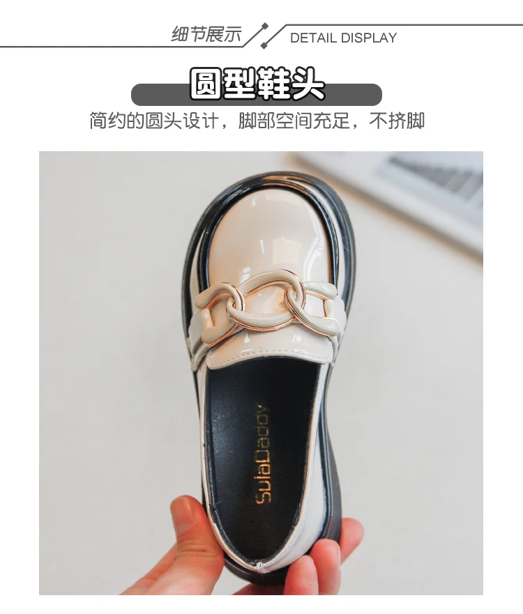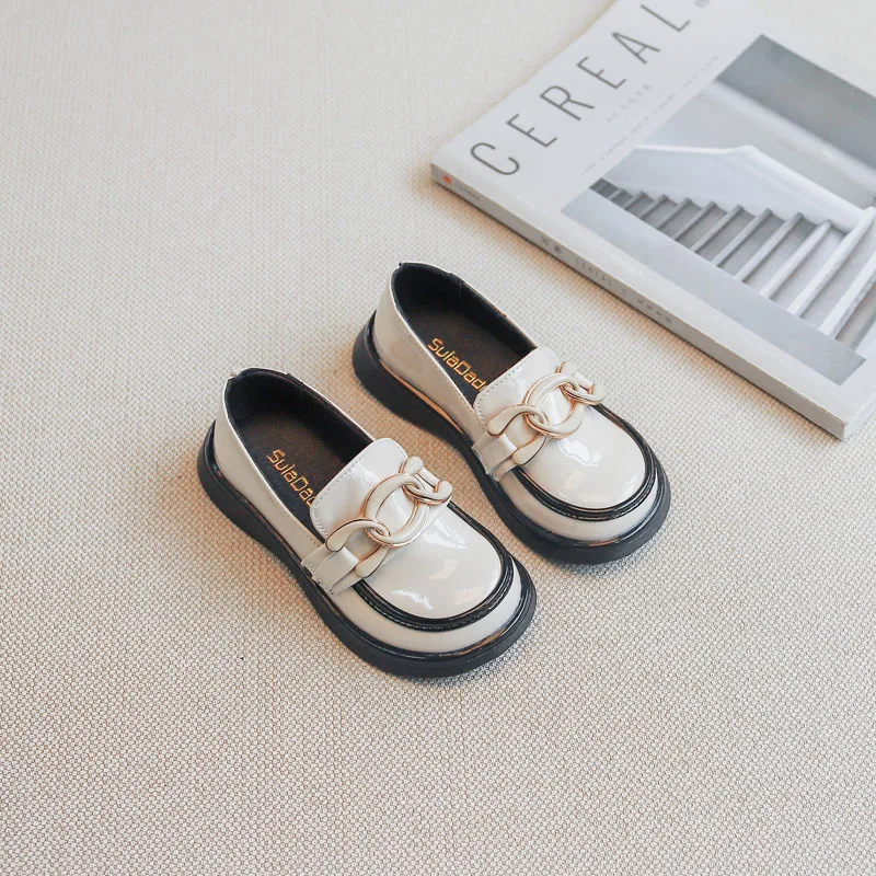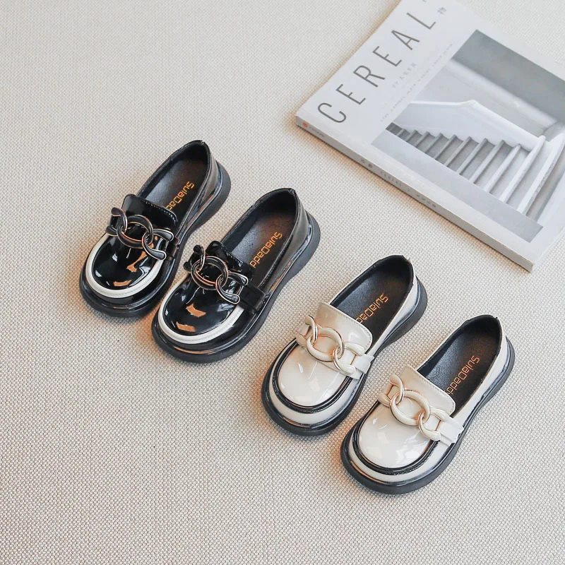 Лоферы детские из лакированной кожи, элегантные туфли на плоской подошве, без застежки, с цепочкой, черные, белые, 23-34, для начинающих ходить детей, весна
