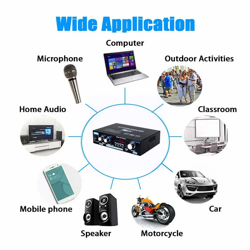 -Для sd-карты, u-диска, входа AUX, воспроизведения формата MP3, поддержка беспроводного подключения bluetooth.