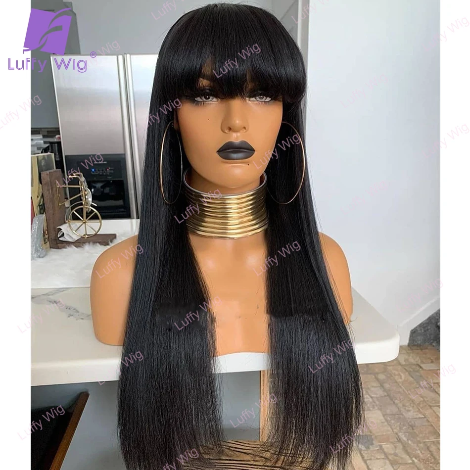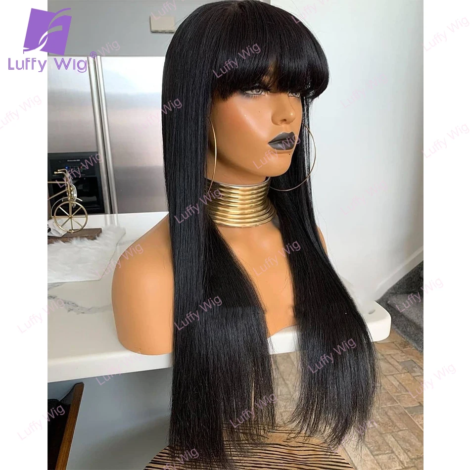 Парик из шелковистых прямых человеческих волос с челкой, бразильская Реми-машина, парик из O-кожи головы, 200 плотность, без клея, для черных женщин, Luffywig