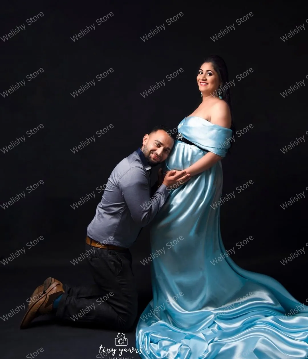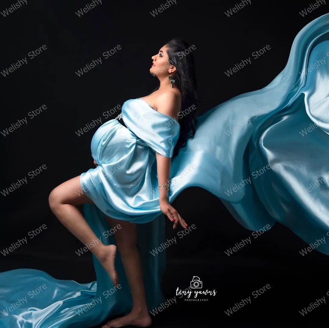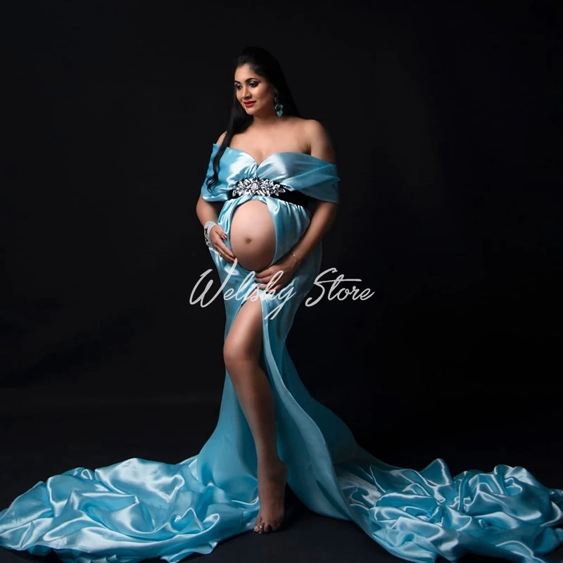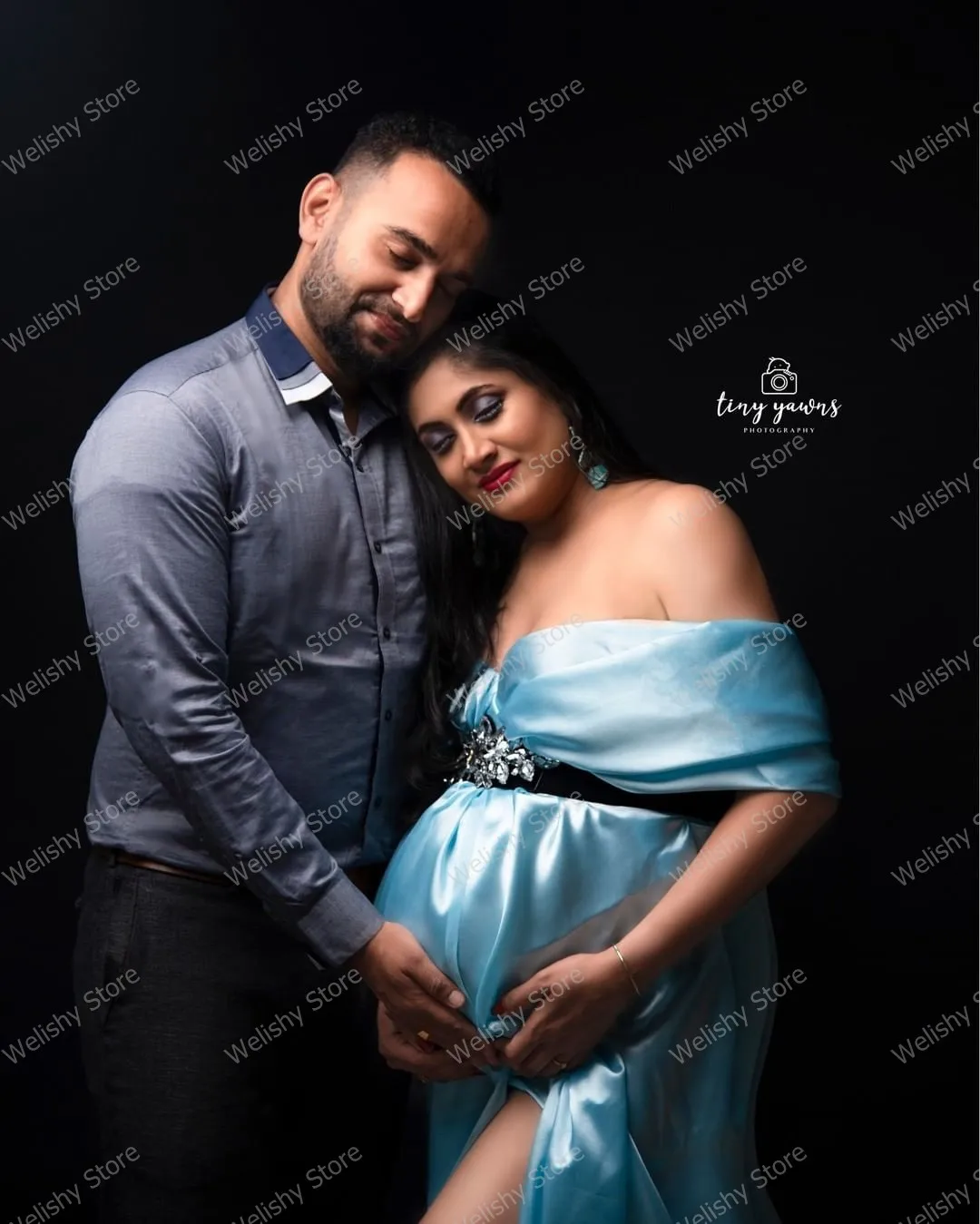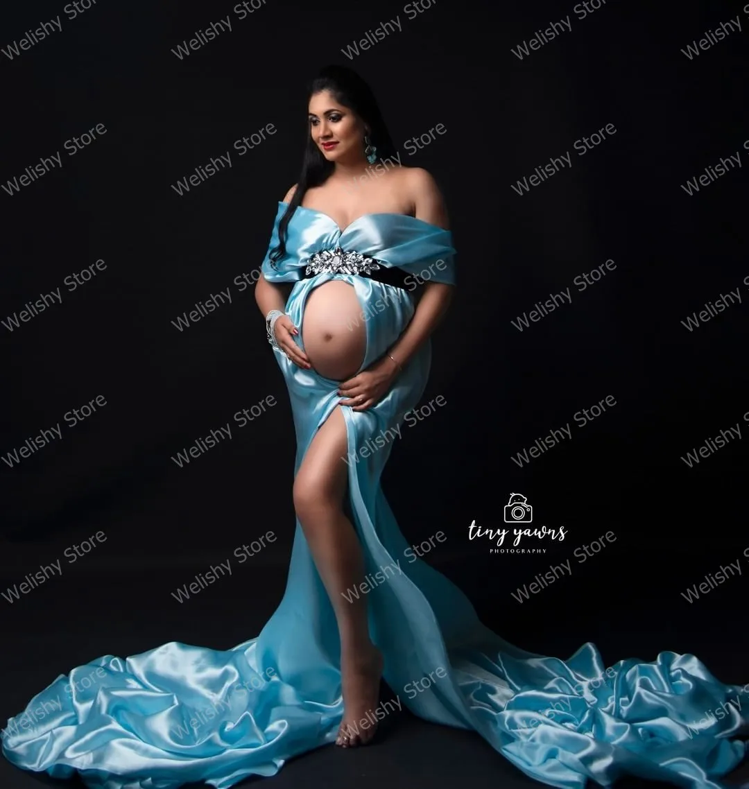 Простое небесно-голубое мягкое шелковое атласное длинное платье для беременных женщин для свадебной фотосъемки элегантное вечернее платье с высоким разрезом