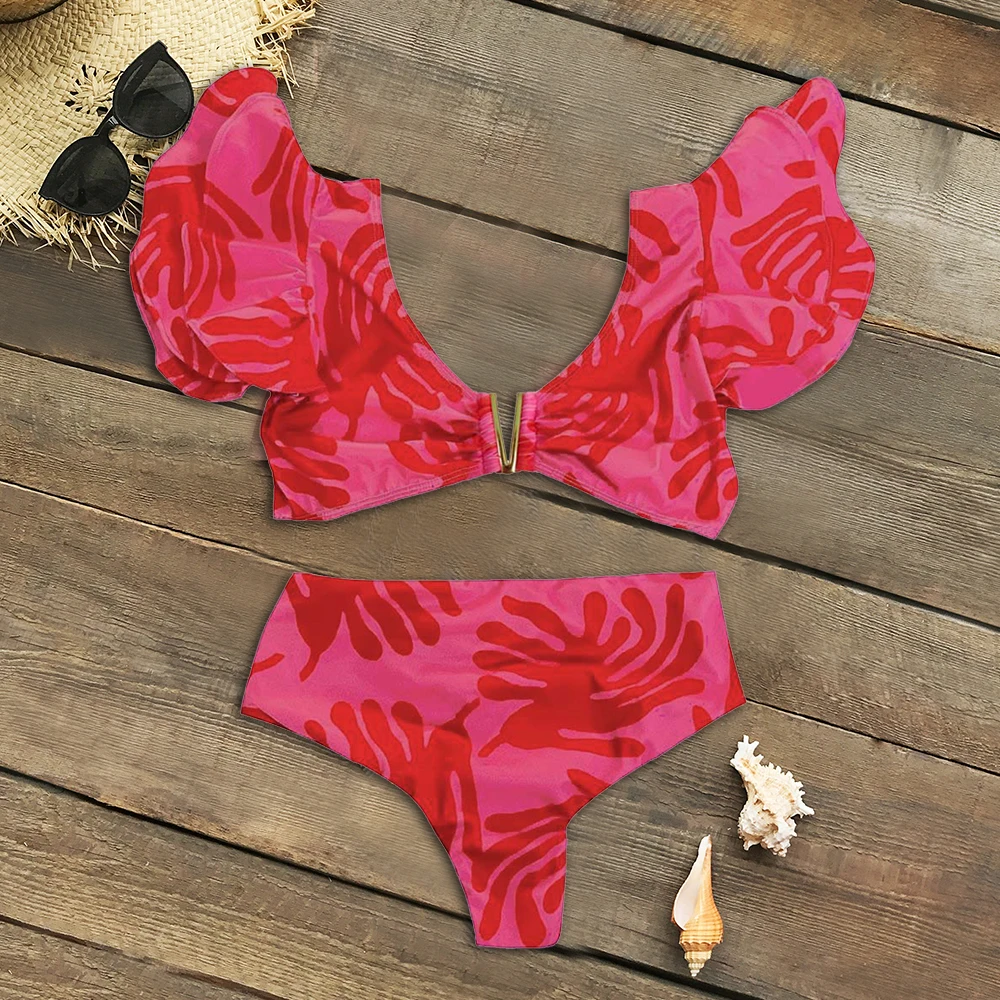 Купальник-бикини с V-образным вырезом и оборками, с высокой талией