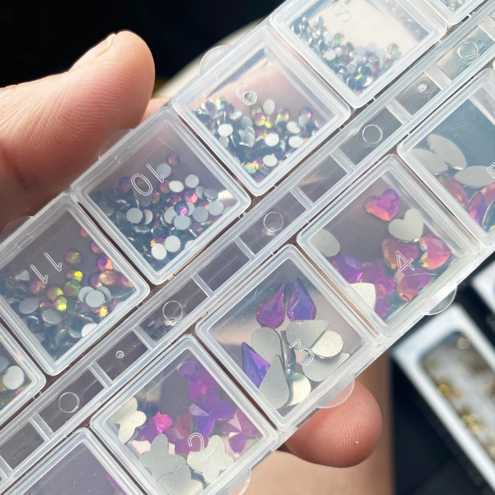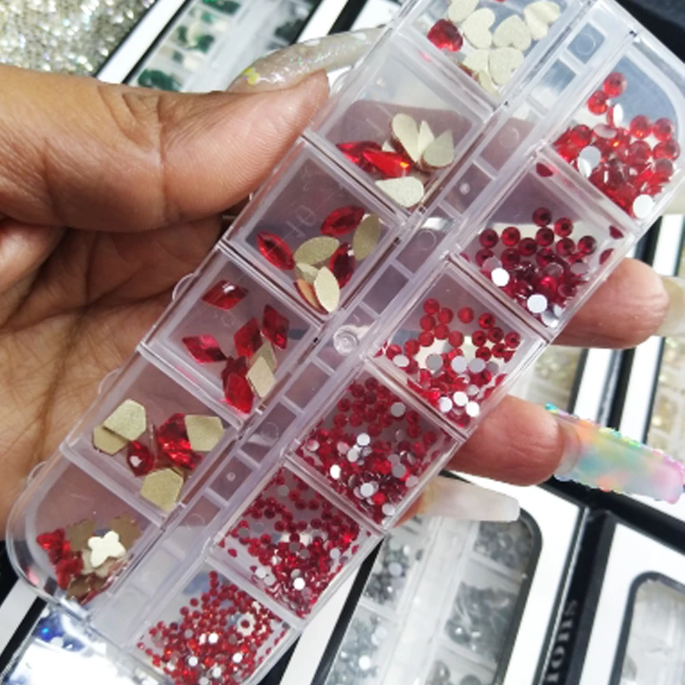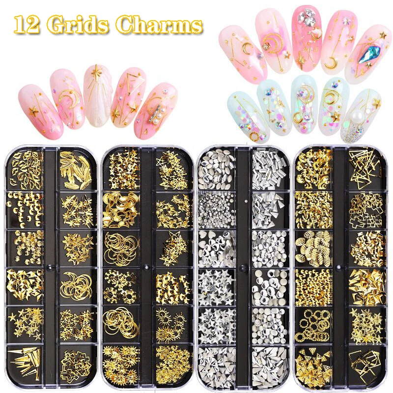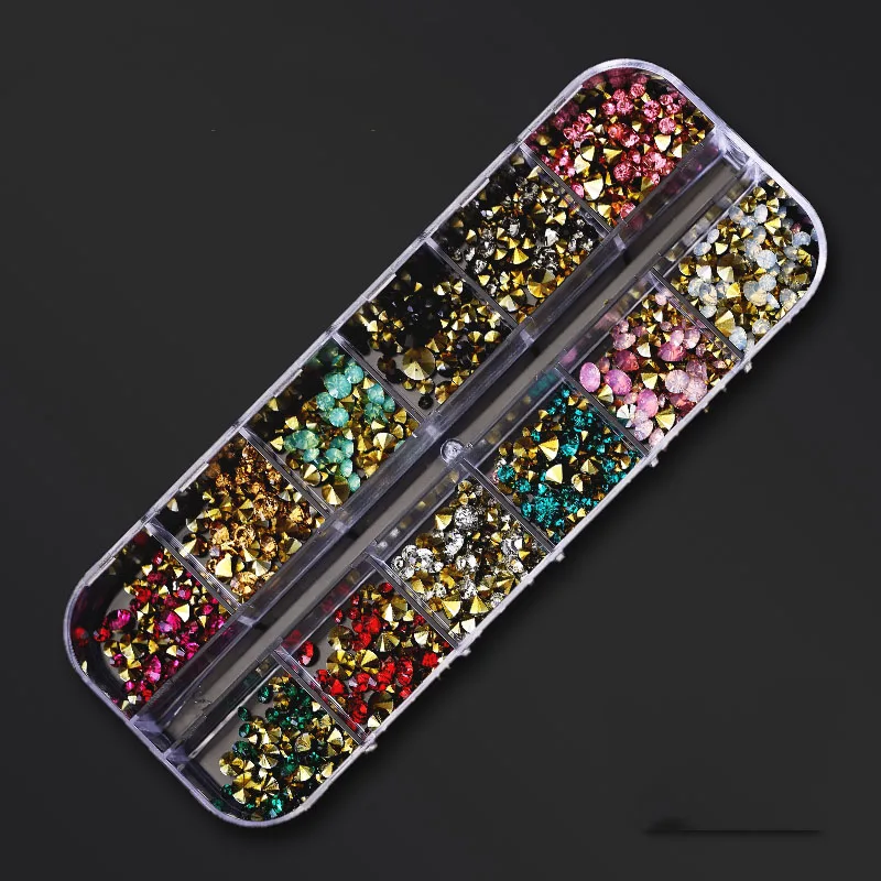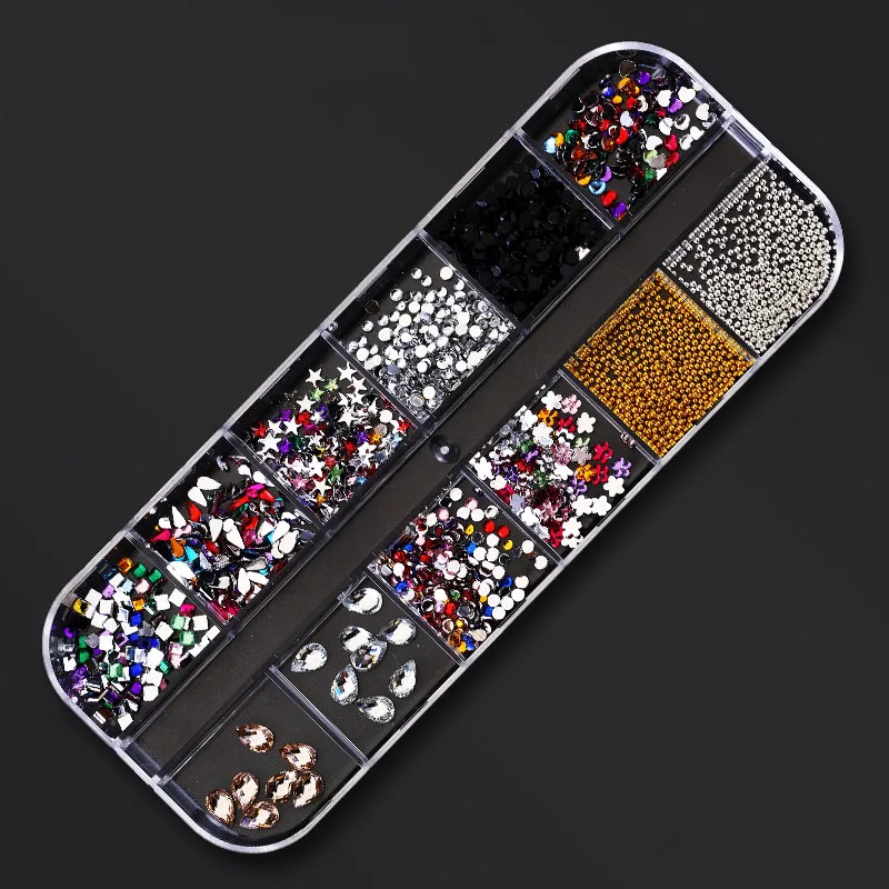 12 ячеек ABкрасочные ногти Стразы смешанного размера металлические заклепки Роскошные ювелирные изделия алмазные драгоценные камни жемчуг 3D блестящие украшения для ногтей P1