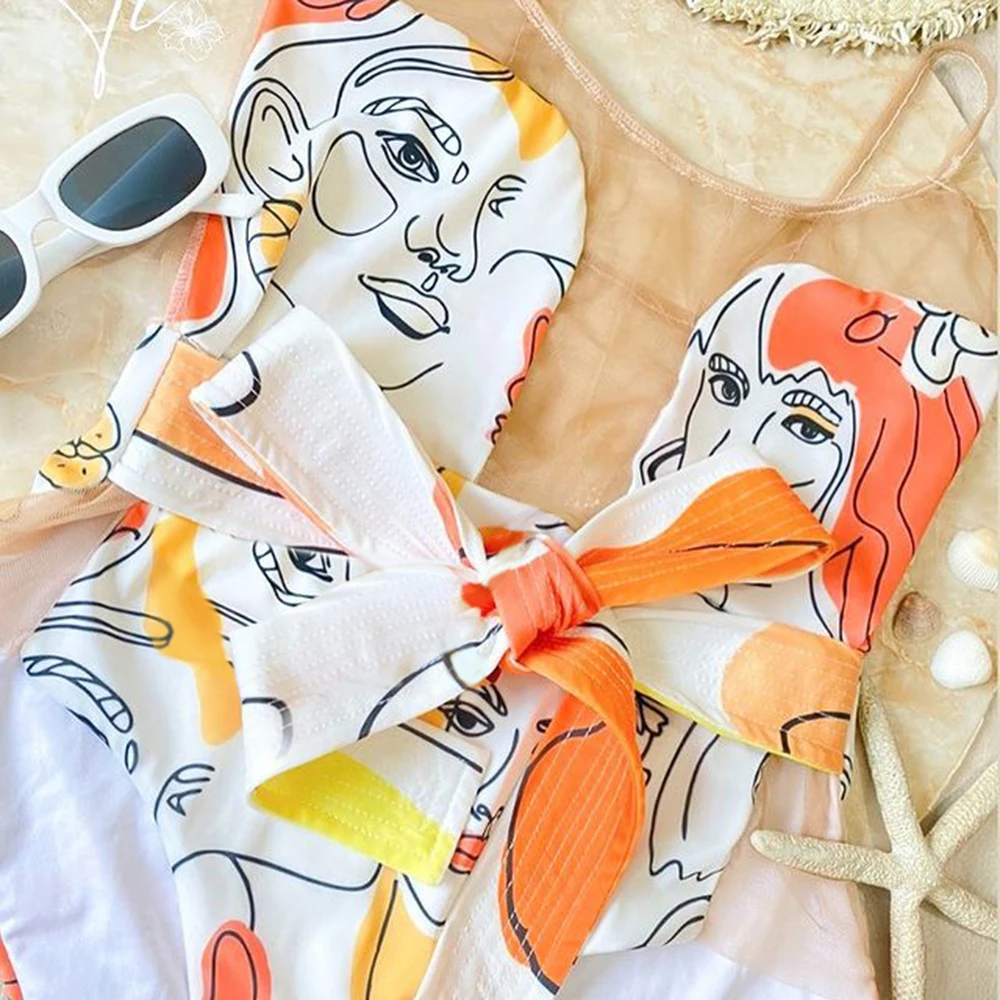 Цельный купальный костюм 2022, сексуальная сетчатая одежда для плавания, женский купальник с поясом, пляжная одежда, купальный костюм с принтом, монокини для плавания