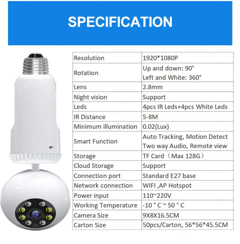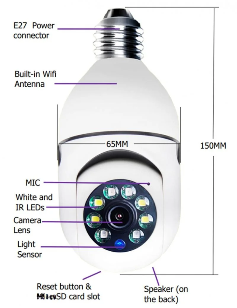 Опишите: 10-15 м (ИК и белый светодиодный) день и ночь Поддержка автоматического отслеживания и звуковой сигнализации Поддержка беспроводного WIFI подключения Поддержка двухсторонних голосовых вызовов и вызовов в режиме реального времени Поддержка панорамирования 355 градусов/наклон 90 градусов Поддержка карт памяти TF до 128 ГБ Поддержка humanoid smart reminder dual lights Поддержка предустановленного положения/сигнал тревоги и сигнал тревоги/функция круиза Удаленный просмотр на смартфоне Спецификация: Тип: Сетевая камера HD: 1080P (full) Объектив (мм): 3,6 мм Цвет: белый Датчик: CMOS Мегапиксели: 2MP Действие будильника: телефонная сигнализация Формат сжатия видео: H.264 Источник питания: E27 Минимальное освещение (люкс): 0,1 Подключение: IP/Network wireless TF карта: 128G TF карта (не входит в комплект) Угол обзора: 360 ° (по Горизонтали)/90 ° (по вертикали) Водонепроницаемость: IP66 Протокол сетевого кабеля: Wi-Fi/802,11/b/g Ночной режим: инфракрасное ночное видение + СВЕТОДИОДНЫЙ полноцветный Поддерживаемая Мобильная система: для Android/ios Размер: 150*65 мм Вес: 290 г Посылка включает в себя: 1 сетевая камера 1 х E27 розетка 1 комплект установки 1 х Руководство