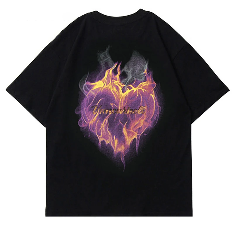Футболка мужская оверсайз в стиле хип-хоп, уличная одежда с графическим принтом огненного пламени и сердца, Повседневная хлопковая рубашка в стиле Харадзюку с короткими рукавами