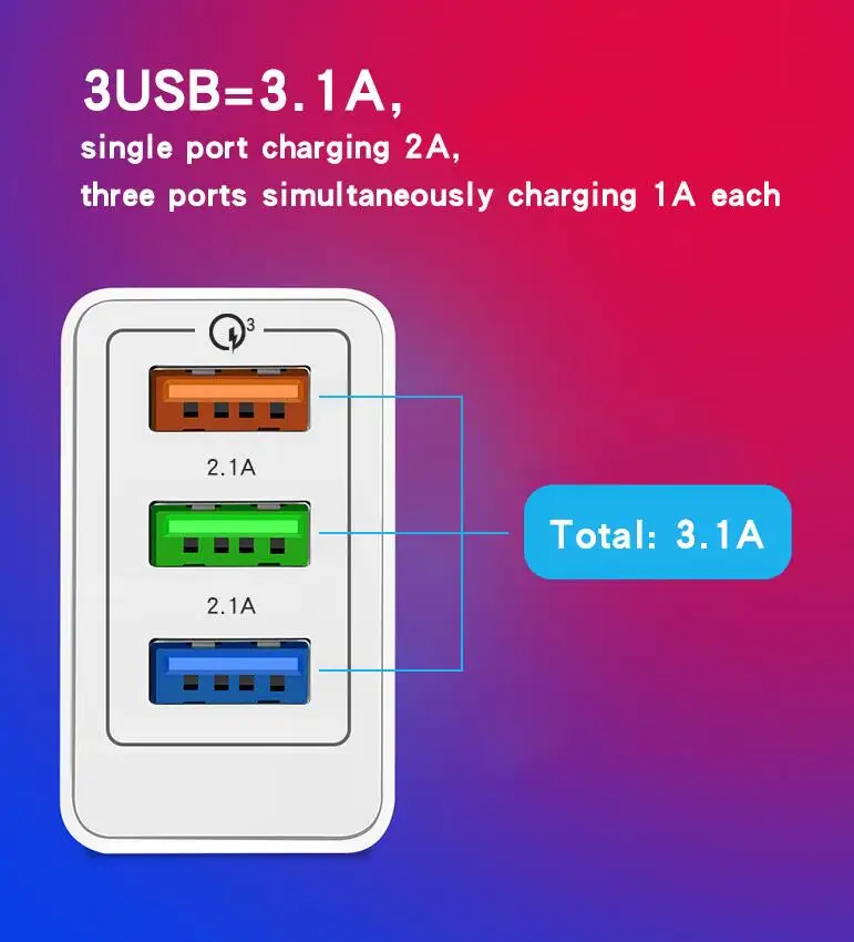 [Название продукта]: 3USB 2.4A [не поддерживает быструю зарядку][Вход]: AC100-240V 50-60 Гц 0.5A[Выход]: 5V 1.2A