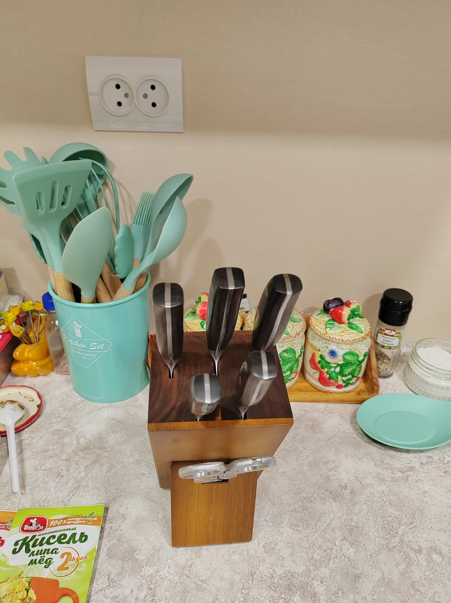 довольно большой набор на кухню. ножи разные, аккуратные и очень острые, ножницы мощные, подставка красивая и удобная. спасибо продавцу, я доволен.