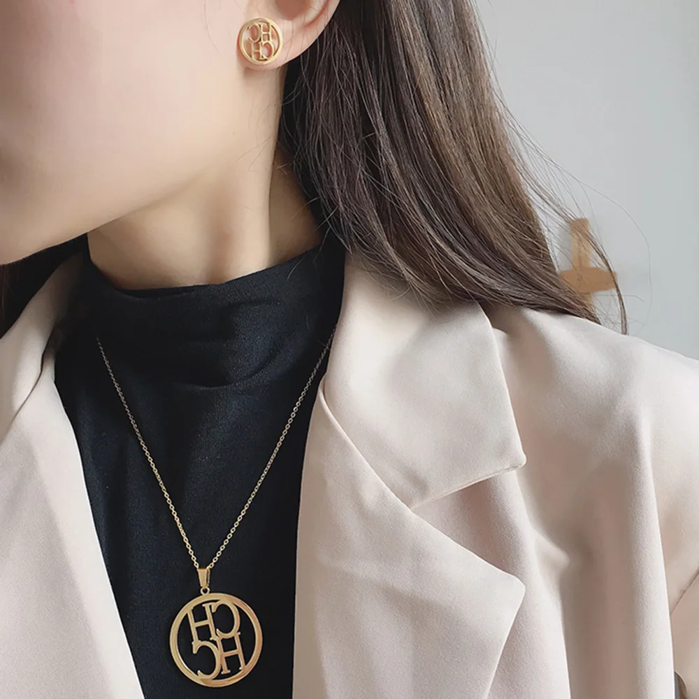 Лидер продаж, высокое качество, ажурный набор сережек с буквами CH, цепочка с круглым кулоном, ожерелье для женщин, модная Роскошная бижутерия