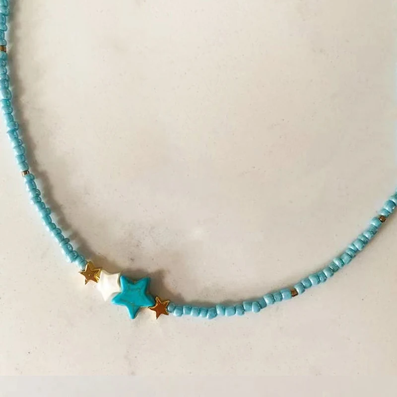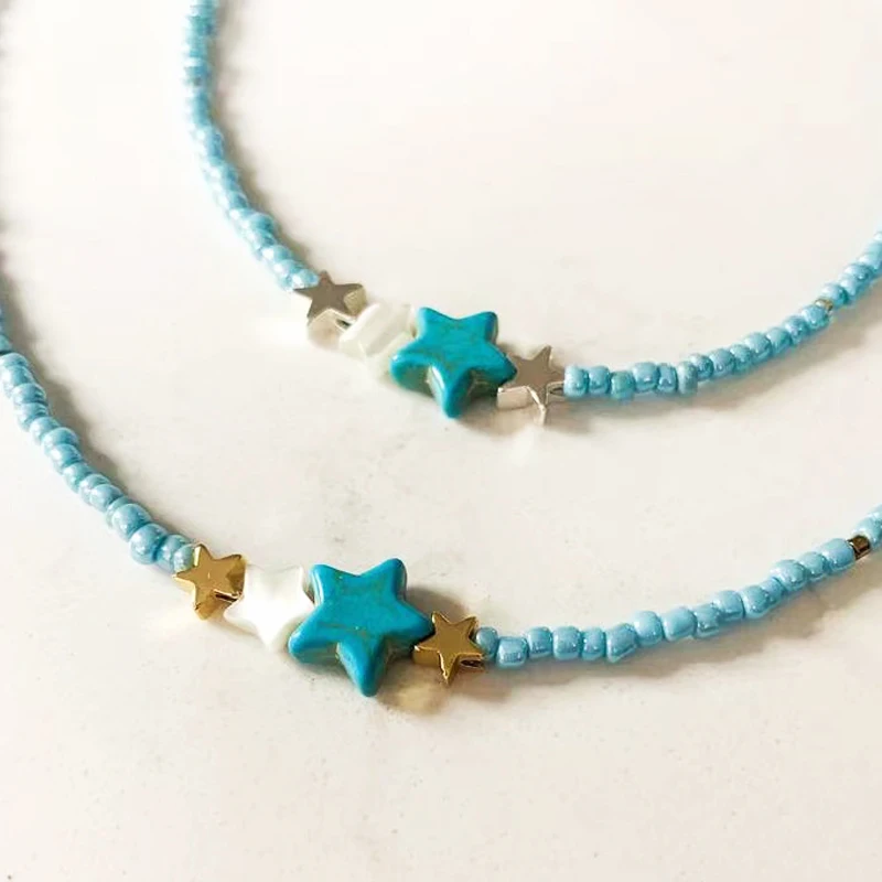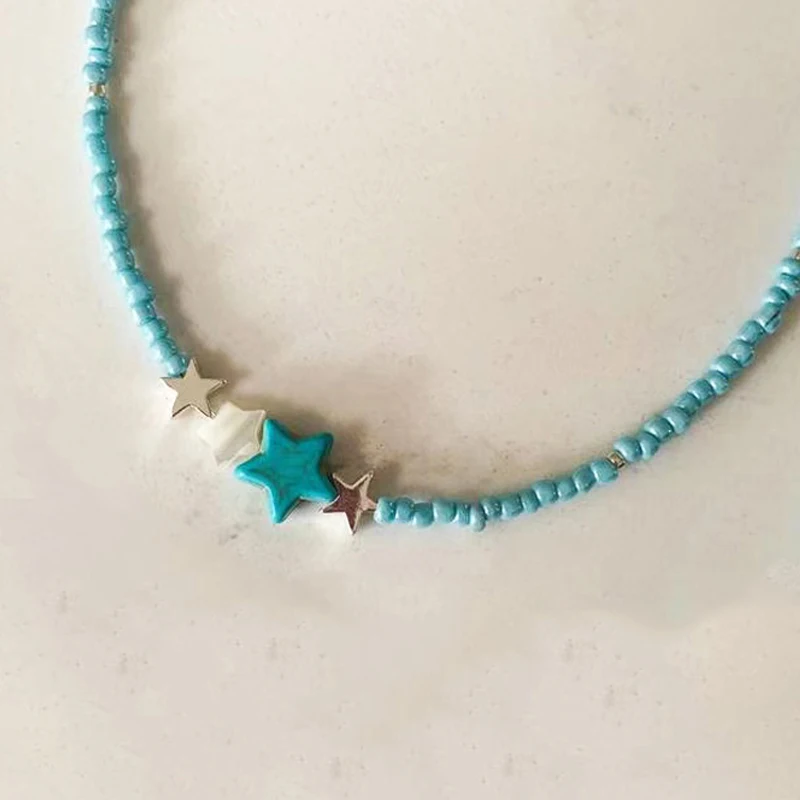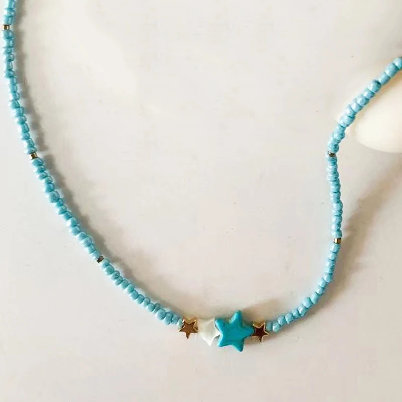 Модное простое ожерелье в стиле бохо с синими рисовыми бусинами, подвеска ручной работы в виде звезды, чокер, золотой цвет, белая ракушка, звезда, женское Очаровательное ожерелье, бижутерия