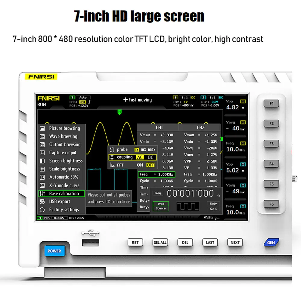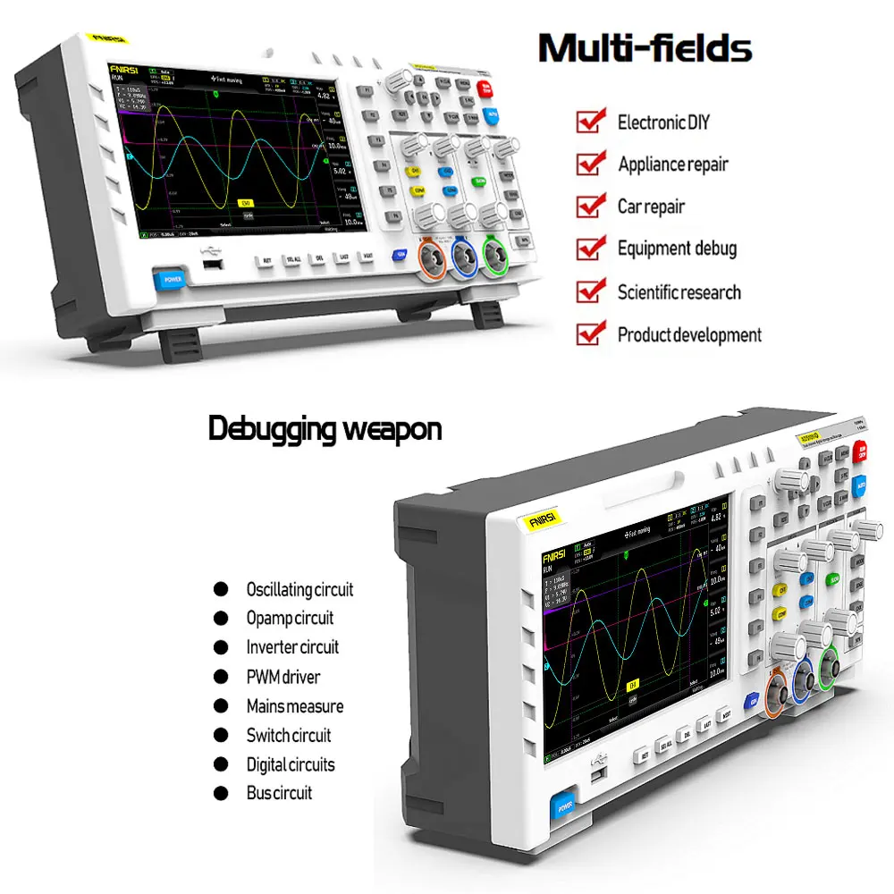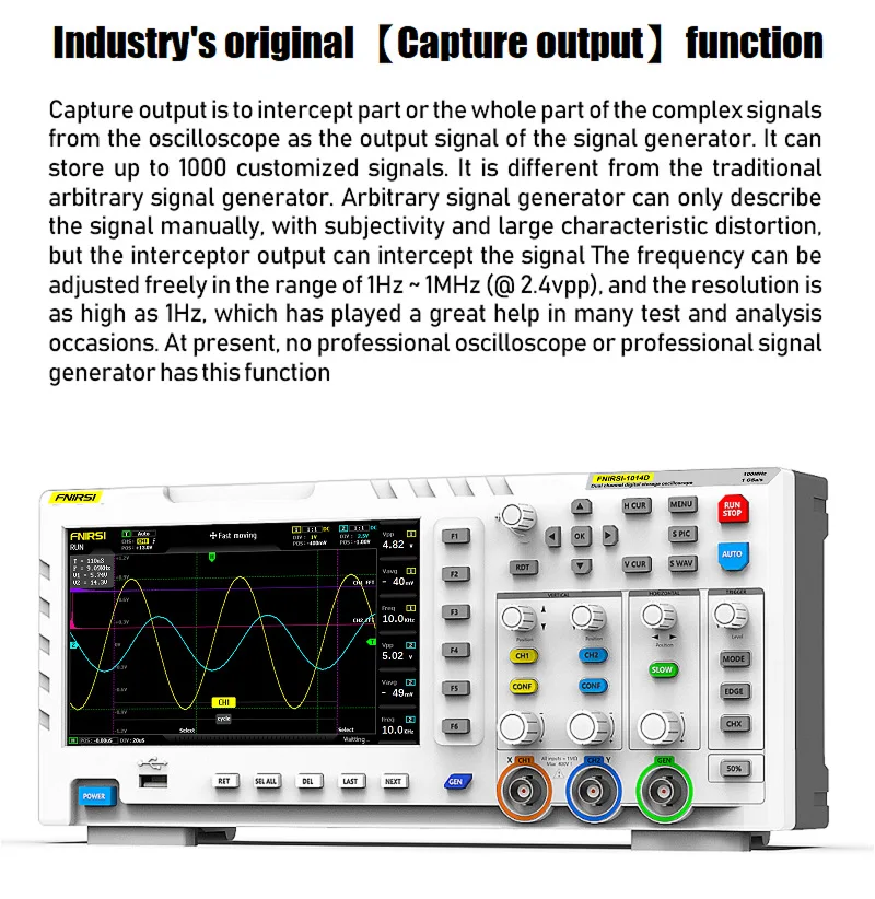 FNIRSI-1014D-это два в одном осциллографе и генератор сигналов, запущенный FNIRSI. Он имеет комплексные функции и высокую практичность. Это экономичный двухканальный Настольный осциллограф для индустрии технического обслуживания и НИОКР. Осциллограф имеет частоту дискретизации в реальном времени 1GSa / s и аналоговую пропускную способность 100 МГц * 2; Полная функция триггера (однократное/нормальное/автоматическое), как для периодического аналогового сигнала, так и для aperiodic цифрового сигнала может быть использован свободно; Встроенный генератор сигналов DDS и оригинальный выходной сигнал в отрасли (@ 2.5vpp), Все шаги частоты сигнала-1 Гц, поддержка 14 видов стандартного функционального сигнала и настраиваемого сигнала, измельчение выходного устройства захватывает часть или всю часть сложных сигналов, измеренных осциллографом как выходной сигнал генератора сигнала, который может хранить до 1000 индивидуальных сигналов отключения; Встроенный модуль защиты от высокого напряжения может выдерживать Непрерывное напряжение до 400 В, не беспокоясь о ДТП при сжигании осциллографа, вызванном тем, что датчик не перемещается на 10x шестерню. Большой режим горизонтальной прокрутки, который может контролировать медленные изменения уровня; Оснащен эффективной одной кнопкой авто, которая может отображать измеренную форму волны без утомительной регулировки; дисплей высокой четкости ЖК-дисплей с 7-дюймовым 800*480 разрешение; Курсором благодаря функции измерения, при ручном чтения амплитуду и частоту параметры, Не нужно считывать фоновые весы и количество, и не нужно конвертировать, чтобы напрямую Получить пик до пика и частоты, чрезвычайно удобная функция захвата экрана и хранения сигналов, встроенная память объемом 1 Гб, может хранить до 1000 фотографий с экрана + 1000 групп данных волноводной формы, Процесс хранения прост и быстр, сохранение текущей формы сигнала одним щелчком, отсутствие громоздких подсказок и выбор для сохранения текущих данных, очень удобный; Мощный менеджер изображений формы волны, поддержка просмотра эскизов, просмотр, просмотр подробной информации о функциях поворота страницы, удаления и увеличения формы волны, Уменьшение и перемещение удобны для вторичного анализа. Фюзеляж оснащен интерфейсом USB, который может быть подключен к компьютеру для реализации совместного использования собственных фотографий экрана и компьютера, что удобно для вторичного анализа; функция графического дисплея Li Shayu может использоваться для сравнения и определения амплитуды, частоты и фазы двух групп сигналов; Функция просмотра FFT может оценить гармонический компонент сигналов; Функция графического дисплея Li Shayu может использоваться для сравнения и определения амплитуды, частоты и фазы двух групп сигналов;