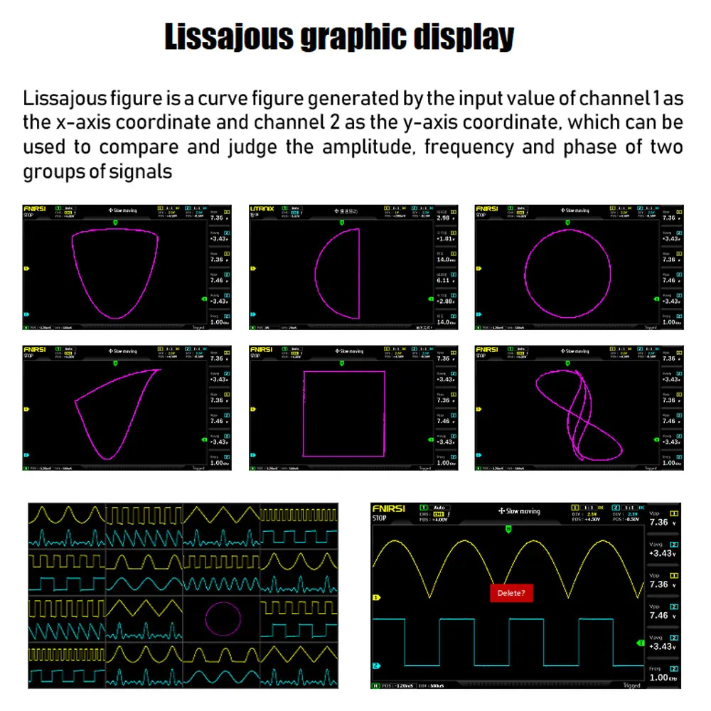 Мощный Графический менеджер поддерживает просмотр эскизов, просмотр, Детальный просмотр, поворот страницы, удаление и масштабирование формы волны, масштабирование, перемещение и т. Д.Оснащен интерфейсом USB, который может быть подключен к com-puter, чтобы поделиться своими скриншотами с com-puter, что удобно для вторичного анализа.Функция графического дисплея Lissajous может использоваться для определения амплитуды, частоты и фазового контраста двух групп сигналов.Функция отображения FFT, может анализировать Спектральные характеристики сигнала, технологию сжатия памяти, экран обновления формы волны не мерцает.С функцией регулировки яркости экрана и функцией регулировки яркости фона gr-id, также легко носить с собой.