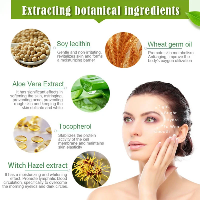 ▶Соевый лецитинНежный и не раздражающий, оживляет кожу и формирует увлажняющий барьер▶Масло зародышей пшеницыСпособствует метаболизму кожи. Анти-старение, улучшает тело и # x27;s Использование кислорода▶Экстракт алоэ вераОн оказывает значительное влияние на смягчение кожи, встраивание,Предотвращение акне, предотвращение грубой кожи и сохранение кожи нежной и белой.▶ТокоферолСтабилизирует белковую активность клеточной мембраны и поддерживает эластичность кожи▶Экстракт гамамелисаОбладает увлажняющим и отбеливающим эффектом. Способствует развитию лимфатической кровиЦиркуляция, специально для борьбы с морскими веками и темными кругами.