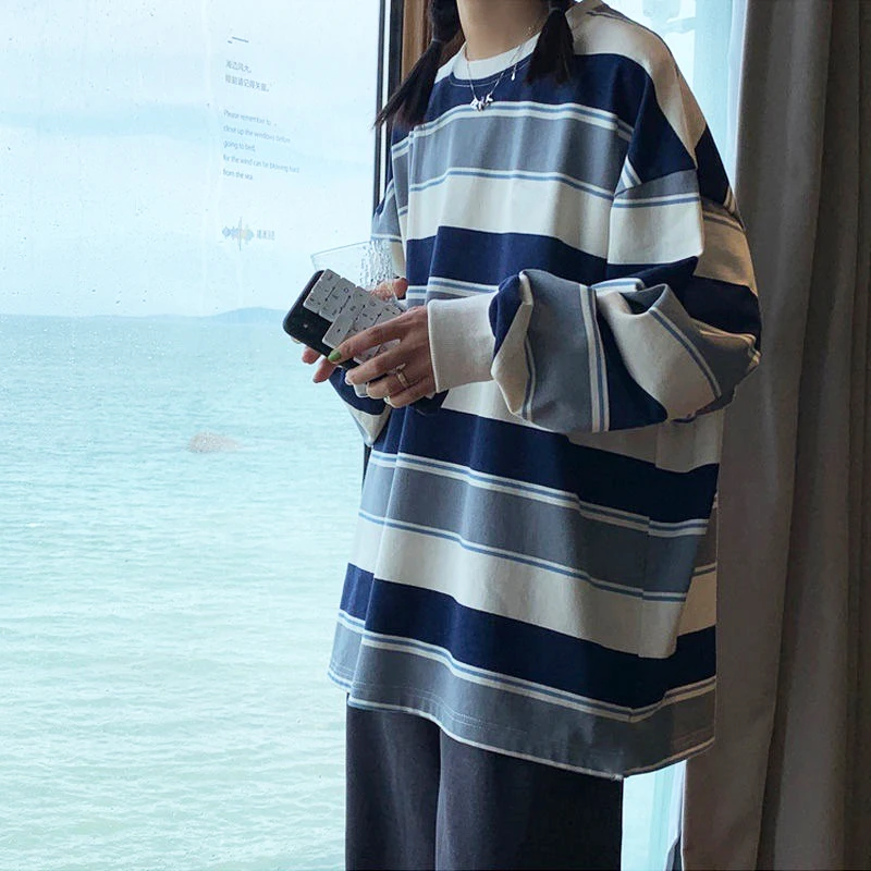 Женская футболка Harajuku оверсайз Повседневная полосатая блузка с длинным рукавом Уличная одежда для пары топы для подростков свободная полосатая блузка пуловеры