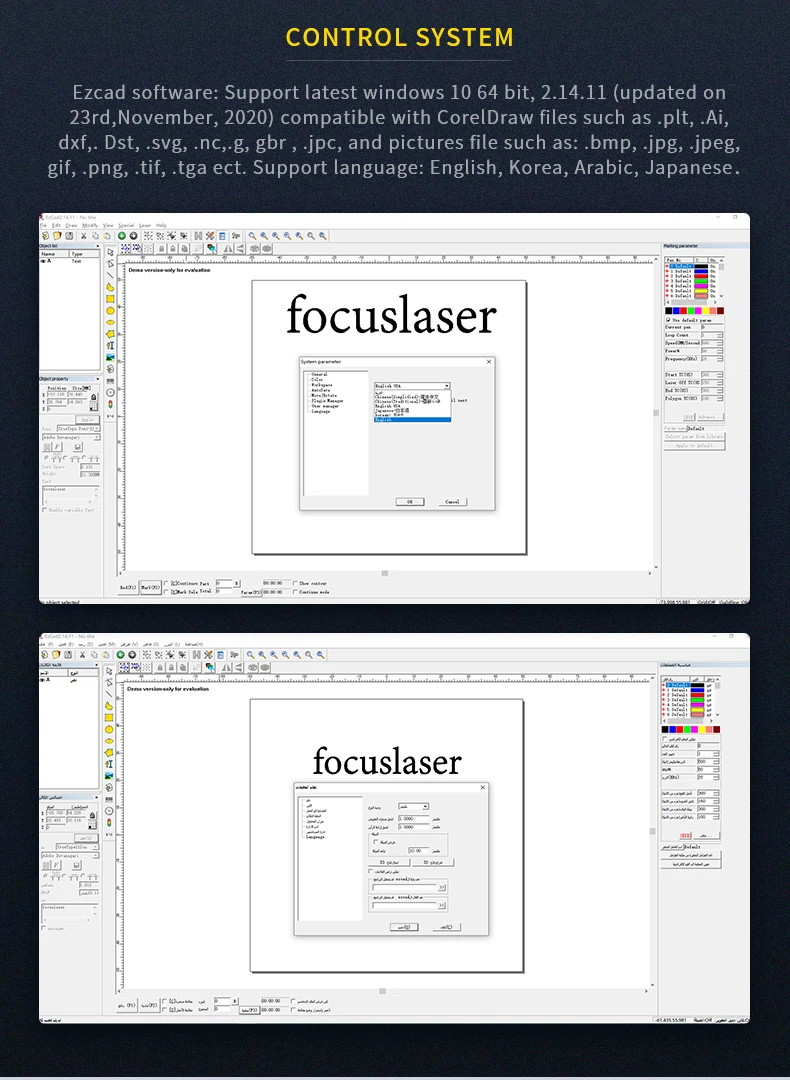 Программное обеспечение Ezcad2: Поддержка последних 64 бит Windows 10, 2.14.11 (Обновлено 23 ноября 2020 года) Совместимость с CorelDraw файлами, такими как. Plt, . Ai, . Dxf,. Dst, . Svg, . Nc,.G, Gbr , . Jpc и изображения, такие как:. Bmp, . Jpg, . Jpeg, . Gif, . Png, . Tif, . Tga Ect. Поддержка всех языков: английский, французский, немецкий, корейский, арабский, португальский, японский, русский, испанский, бразильский, Мексиканский, итальянский и т. Д.