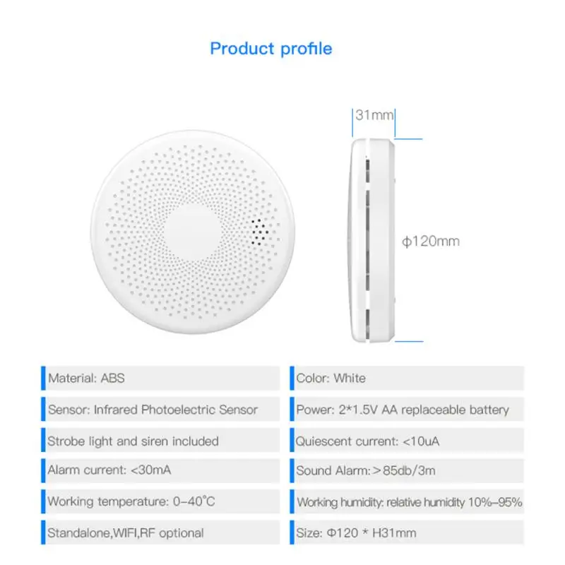 4. Высокочувствительное Обнаружение дыма: при возникновении пожара Датчик будет чувствительно обнаруживать дым, отправлять сигнал тревоги, а затем направлять уведомление на ваш смартфон, чтобы защитить людей и свойства. Эксклюзивный интеллектуальный алгоритм дыма имеет высокую чувствительность, отсутствие ложной тревоги и сильную способность анти-помех.