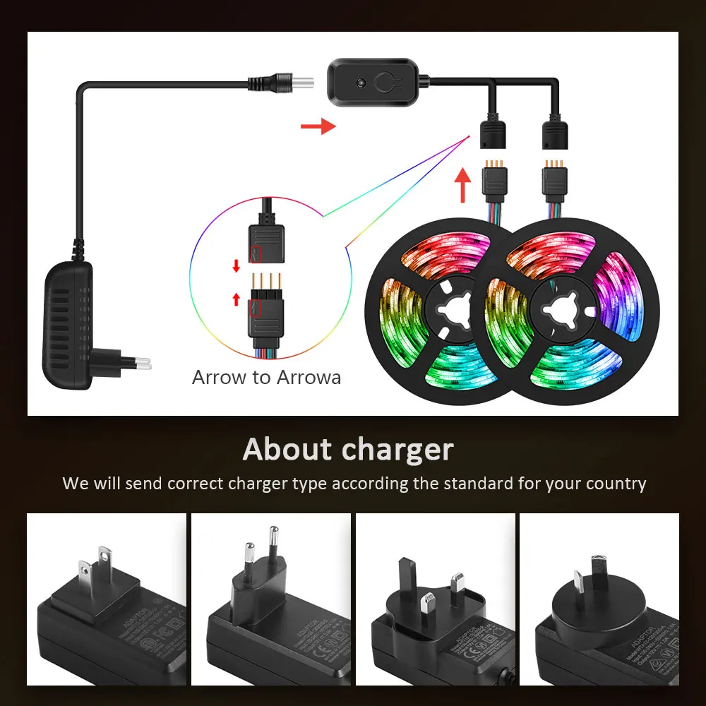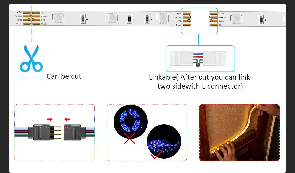 1 при подключении, пожалуйста, убедитесь, что стрелка на той же линии2. Снимите ленту перед использованием, иначе светодиодный светильник будет поврежден3 полоса может быть вырезана вдоль отметок и соединена с светодиодный разъемом