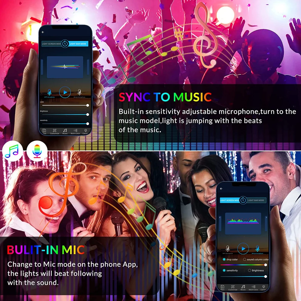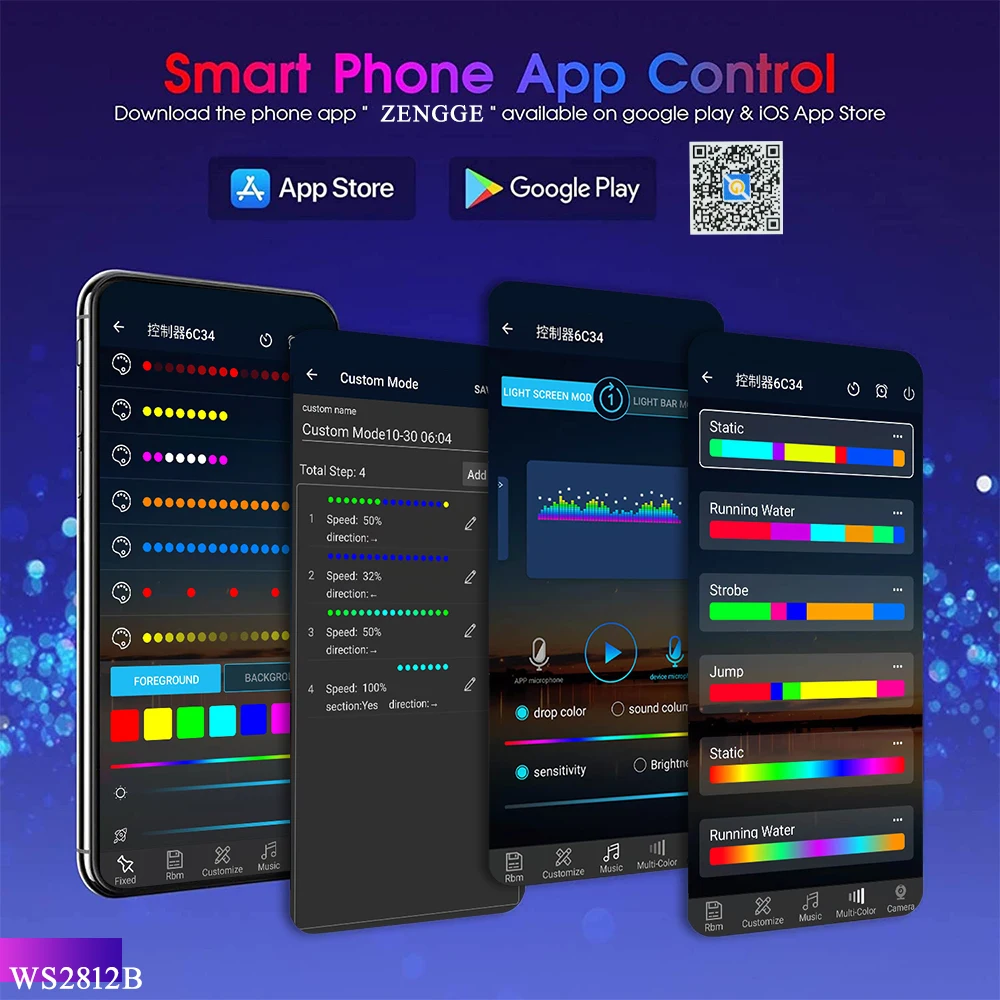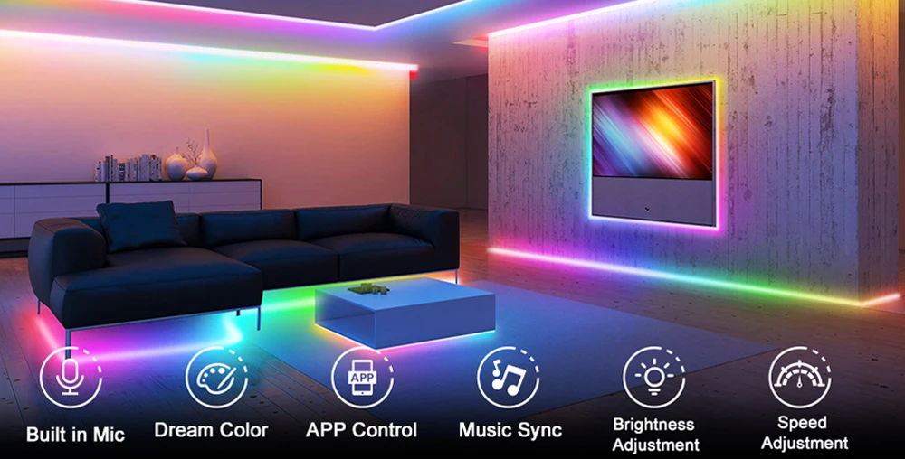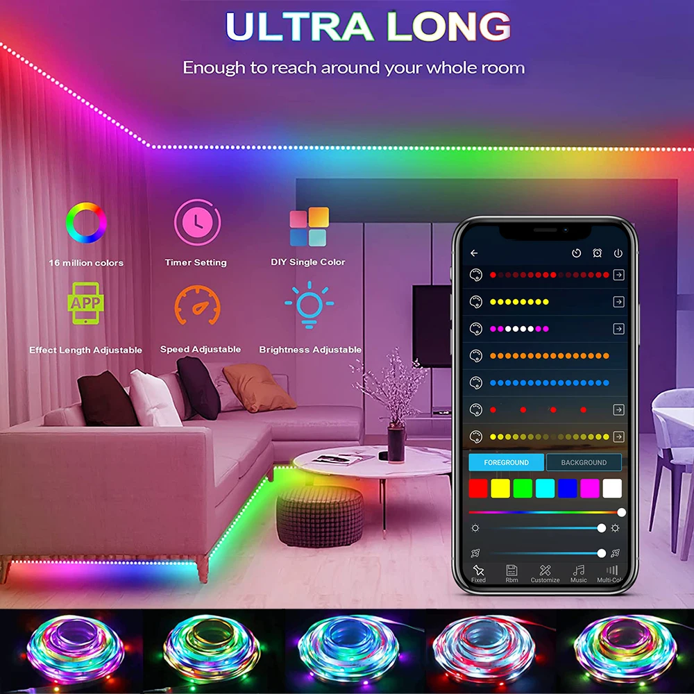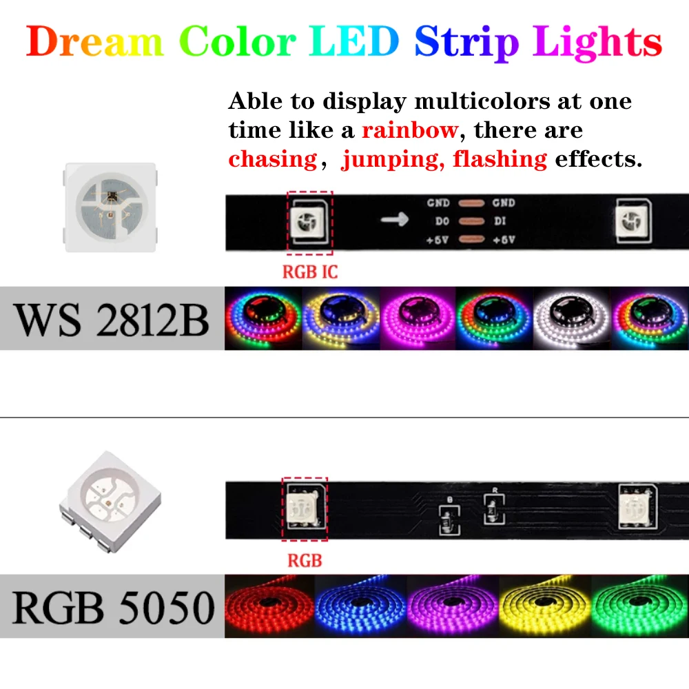 Особенности:1. Поддерживает управление через приложение Bluetooth и беспроводное управление RF.2. Встроенный микрофон с музыкальными и немузыкальными эффектами, множество параметров регулируется.3. С функцией автоматического сохранения параметров настройки.Длина светодиодной ленты: 1 м/2 м/3 м/4 м/5 м/10 м/15 м/20 м/25 м/30 мМетод контроллера:1. Беспроводной контроллер RF (без аккумулятора).2. Bluetooth Smart APP.Адаптер питания: 5 В постоянного тока.Водонепроницаемость: IP20 не водонепроницаемый.● Светодиодная лента DreamColor: наши светодиодные музыкальные лампы используют передовые микросхемы IC, которые могут отображать несколько цветов одновременно, как радуга, есть чеканка, прыжки, мигающие эффекты. Более необычные и яркие, чем светодиодные лампы RGB.● Режимы изменения насыщенного цвета:Контроллер Bluetooth:Поставляется с 100 режимами изменения цвета музыки, которые являются яркими и красивыми. Он может автоматически менять цвета или следовать вашей команде в режиме non-music.● Статический цвет и яркость регулируются: если вы не хотите, чтобы музыкальный режим, настройте его на статический цвет, который используется для освещения, например, белый, красный, зеленый, синий и так далее. Можно регулировать яркость каждого цвета.● Многократное использование:1. Используется для украшения автомобильного и велосипедного, пограничного или контурного освещения.2. Широко используется для украшения дома, отелей, клубов, торговых центров.3. Архитектурное декоративное освещение, изысканное атмосферное освещение.4. Широко применяется при заднем освещении, скрытом освещении, освещении буквы канала.5. Аварийное и безопасное освещение, освещение рекламных знаков.6. Декоративные светильники для праздников, мероприятий, выставки.