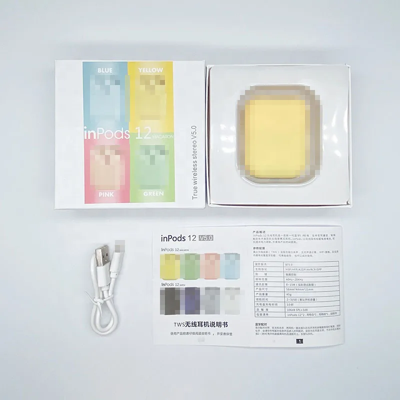 Название бренда: inpods 12Вес: 33 гЦвета: черный/ярко-белый/желтый/светло-голубой/зеленый/серый/темно-синий/розовыйСпецификация:Чип для наушников: чип Realtek 5,0Метод управления: касание отпечатков пальцевЧип Bluetooth/версия: V5.0 + EDRСопротивление динамика: imm32omega15 %Чувствительность микрофона: + -40 дББеспроводная Частота: 2,405 ГГц-2,480 ГГцИндикатор заряда батареи: перезаряжаемый полимерный литиевый аккумулятор ma * 2 + 500 мАРабочая температура: -10-55 обезжиривательМощность: DC5VМатериал: PC + ABSПоддержка форматов файлов: A2DP, AVRCP, HSP, HFPМощность передачи: класс 2Беспроводное расстояние: около 10 мЕмкость аккумулятора: 400 мАчЕмкость аккумулятора для наушников: 50 мАчВремя работы: 3-5 часов (зарядная коробка может заряжать 4 раза для двойных наушников)Время зарядки: 1-2 часаПосылка включает в себя:2 * наушники1 * зарядный отсек1 * зарядный кабель1 * Руководство пользователя