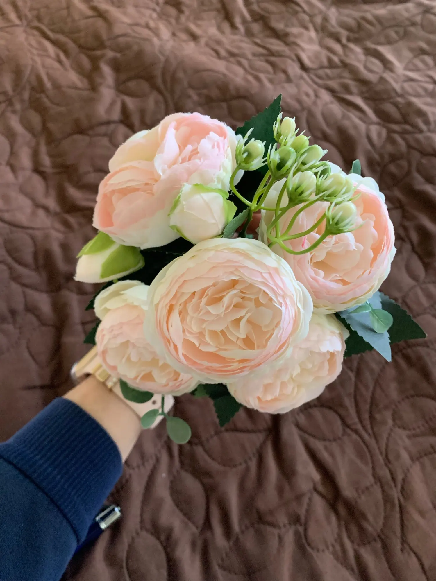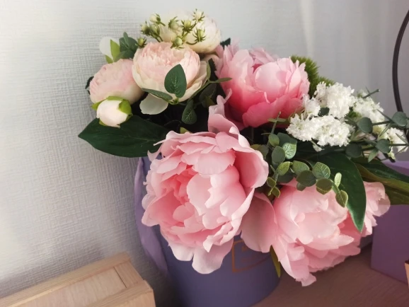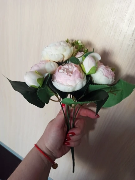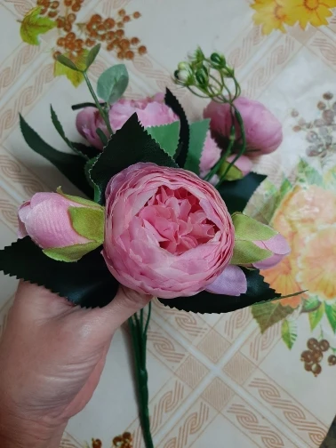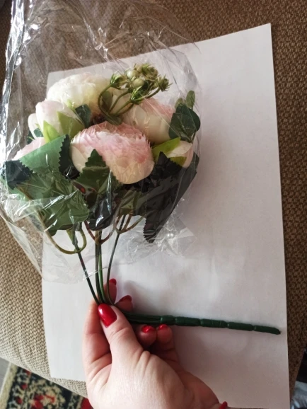 Цветы гораздо бледнее, чем получаются на фото. Пионы маленькие, не подошли для моей задумки. На фото видны цветы, которые крупнее и ярче - я хотела сделать совместный букет. Результат мне не нравится. Нов целом, цветы хорошие, качественные, рекомендую.