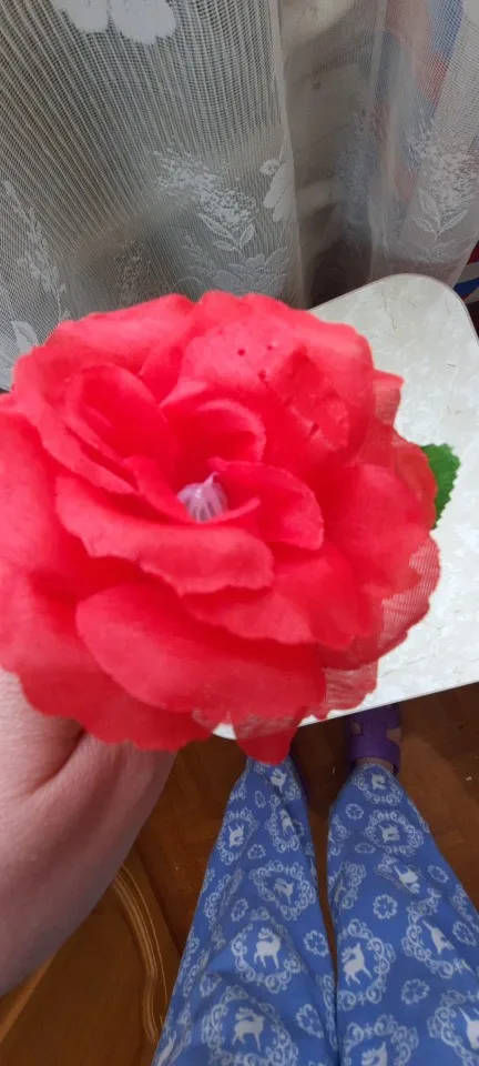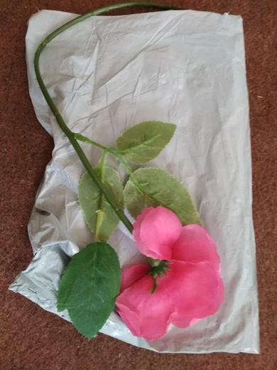 доставка месяц. выиграла за цент и монеты. продавец честный не втюхал доставку. листвы мало лишь две веточки. цветок тканный. стебель жёсткий и длинный.
