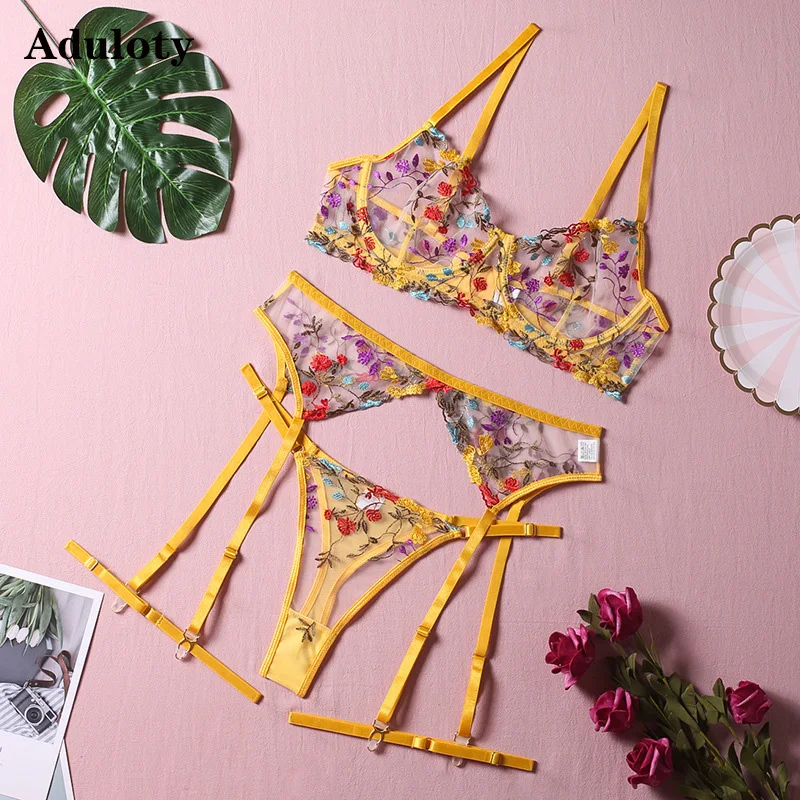 Вышитое нижнее белье из 3 предметов, женское нижнее белье с подвязк...