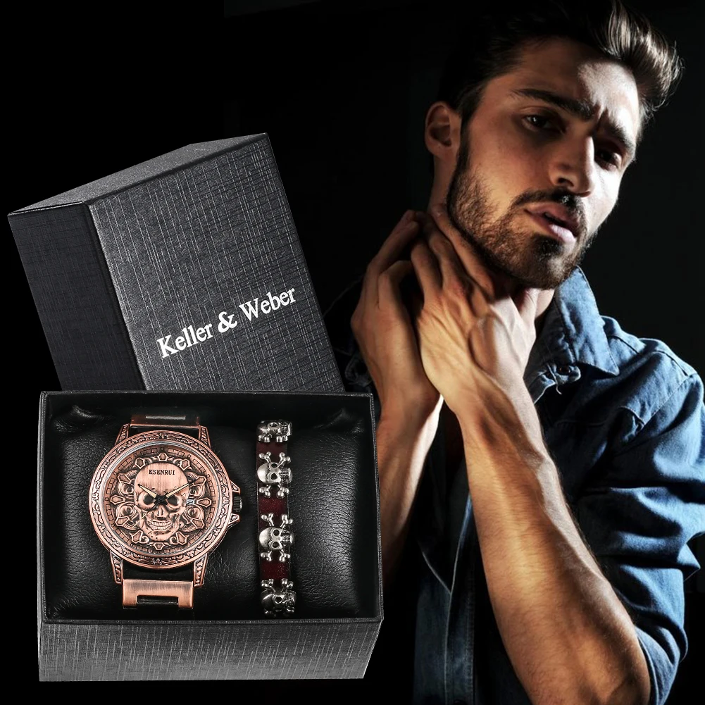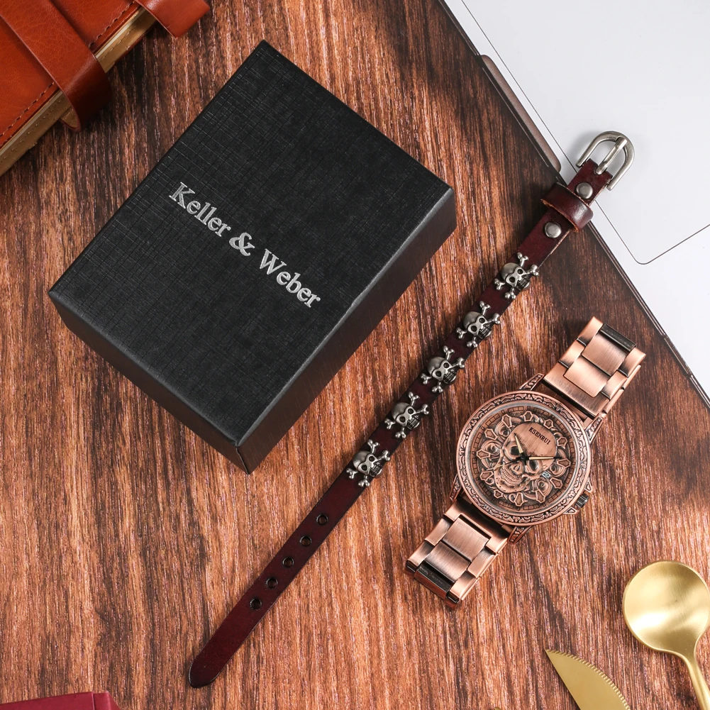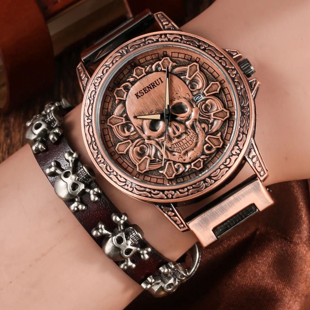 Мужские часы Роскошные красные медные Ретро рельефные череп календарь кварцевые наручные часы Модный повседневный кожаный Лучший браслет набор для мужчин