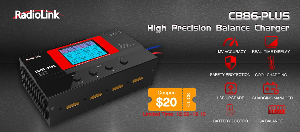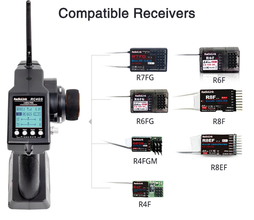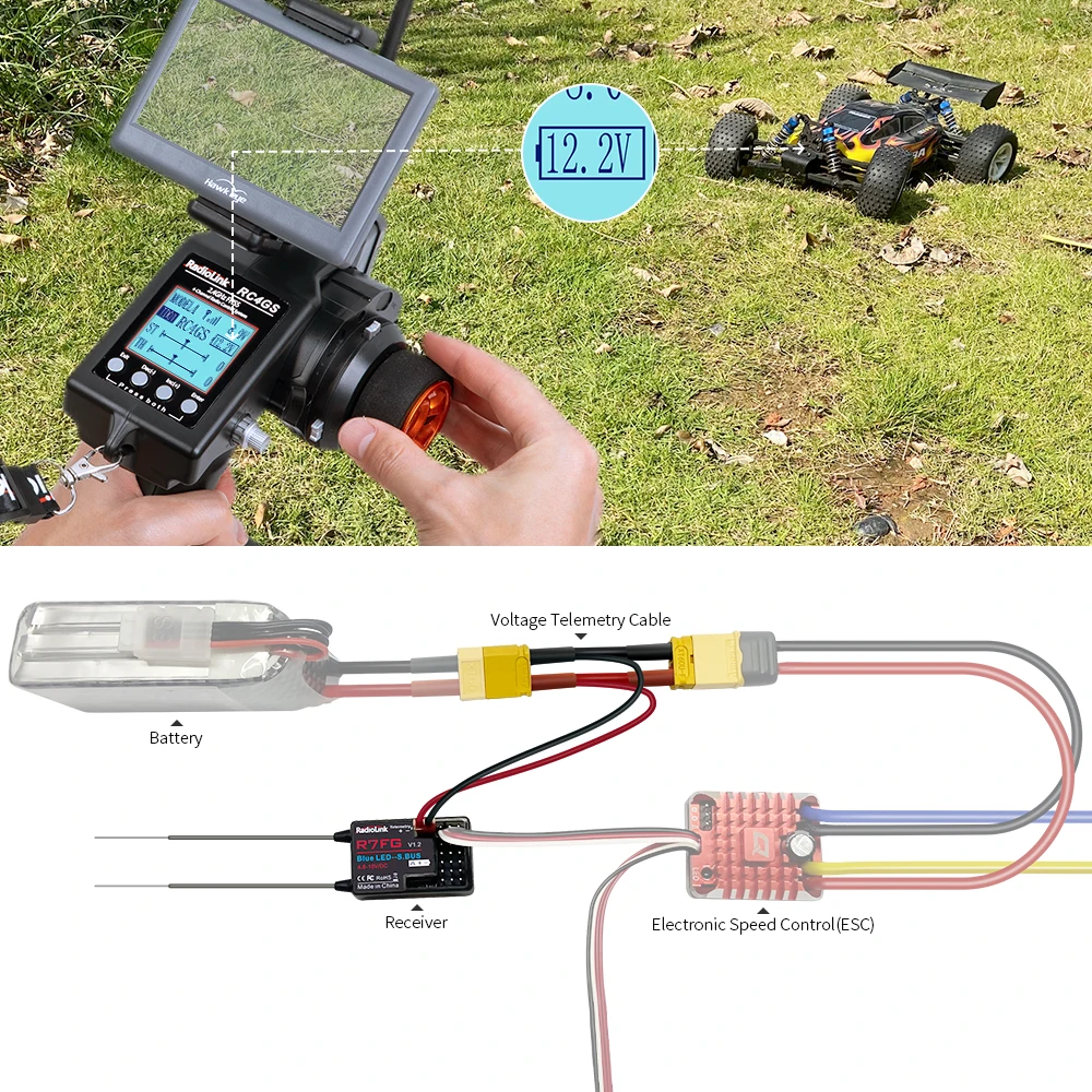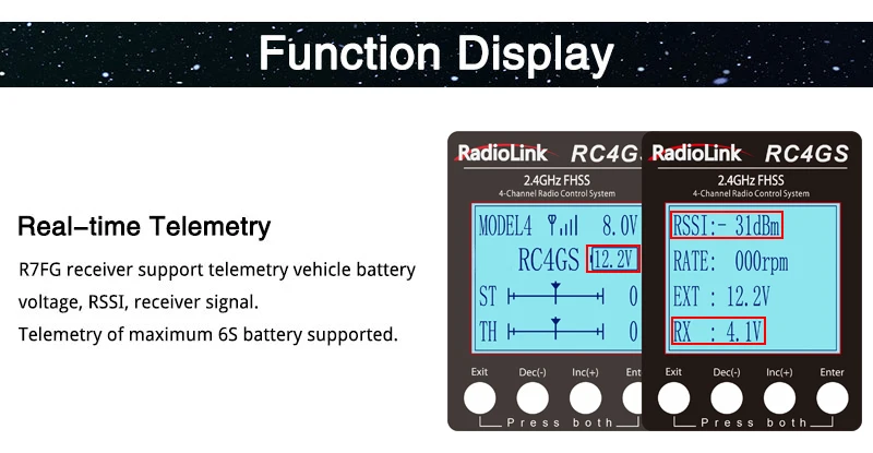 4. 【 информация в реальном времени: напряжение батареи, RSSI, сигнал приемника может отображаться на экране, когда он работает с приемником Radiolink R7FG.