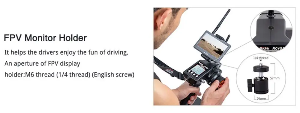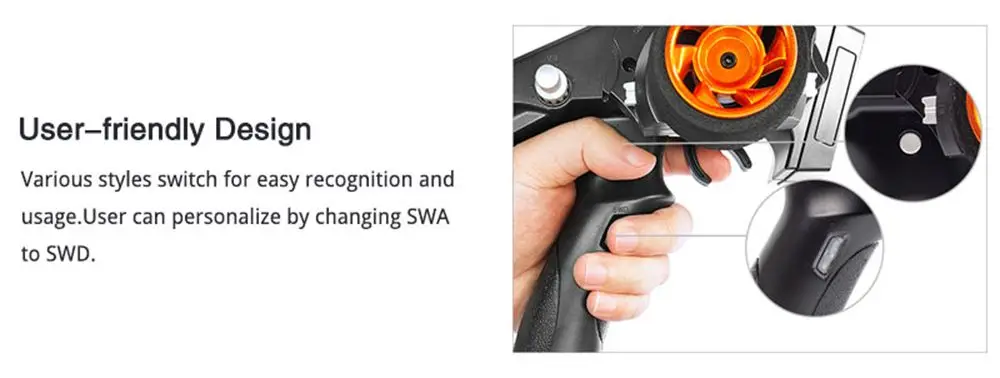 8. 【Superb эргономичный 】: форма ручки более линейная и удобная с эргономичным дизайном. Полоски на триггере увеличивают трогательное трение. Добавлен крюк, отверстие держателя монитора FPV и переключатель такта.