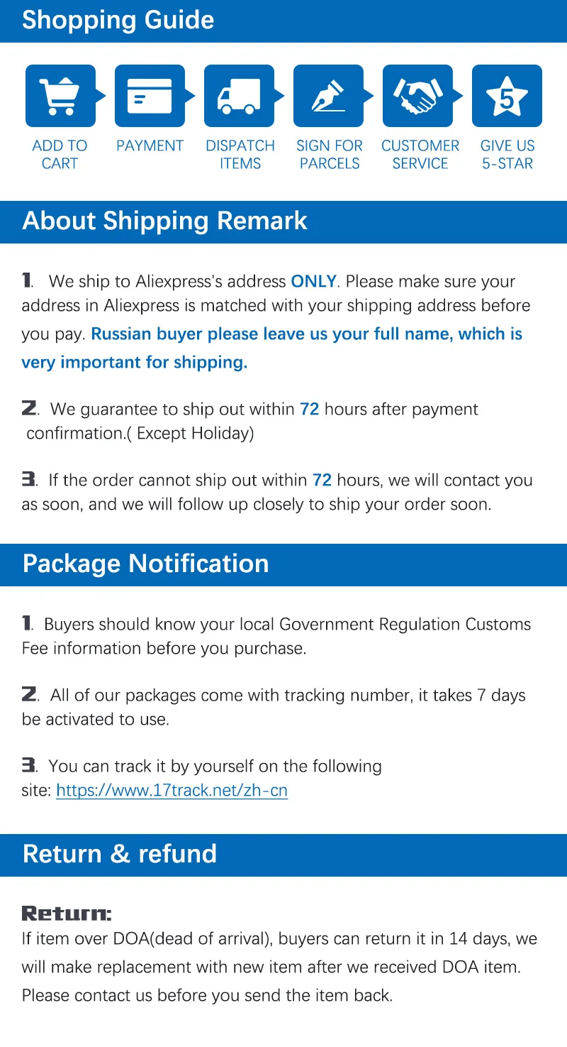 1. Мы поддерживаем дропшиппинг, любые коммерческие документы не включены в посылка, пожалуйста, не стесняйтесь заказать, и мы организуем доставку в течение 12-48 часов. Информация о доставке может быть отслежена.