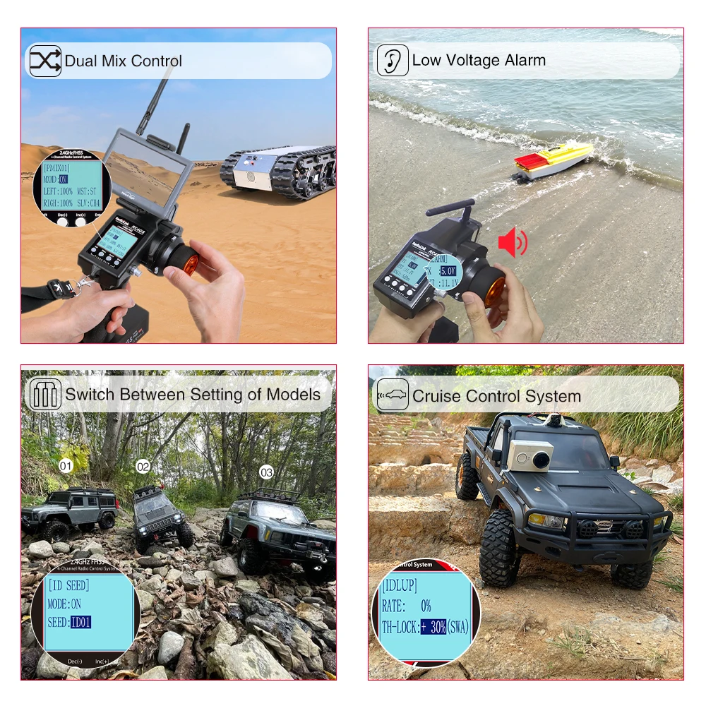 Любые два канала могут быть запрограммированы и каждый канал может быть настроен. Вот на ощупь для двухмоторный транспортных средств, как, например, танки, лодки, 4 автомобиль рулевое колесо.