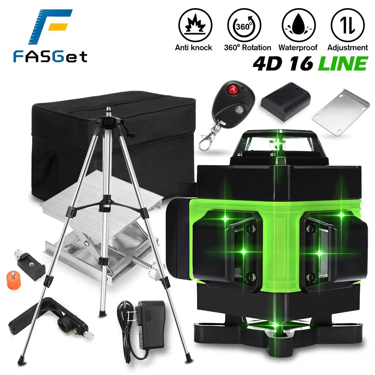 Лазерный уровень FASGet, 16 линий, 4D, самонивелирующийся на 360 градусов, горизонтальный и вертикальный крест, сверхмощный зеленый лазерный луч
