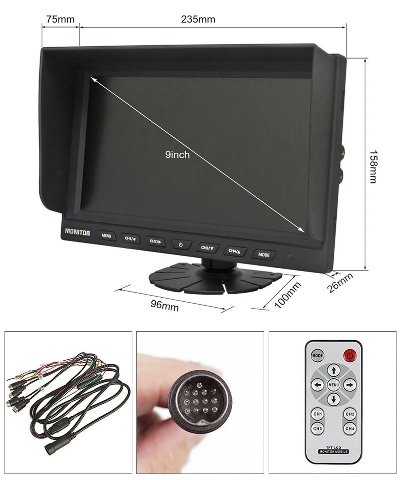 Этот монитор 9 "широко используется в автомобилях, автобусах, контейнерных грузовиках, коммерческих автомобилях, грузовиках, строительных автомобилях, пожарных грузовиках, кораблях и других видах транспорта.До четырех камер могут быть подключены к сигналу, широко используются в различных транспортных средствах. Подходит для холодного напряжения, сильной защиты от помех, встроенной защиты от теплового тока.Один экран может быть разделен на два или четыре экранных представления, каждый экран может отображать различные видео.