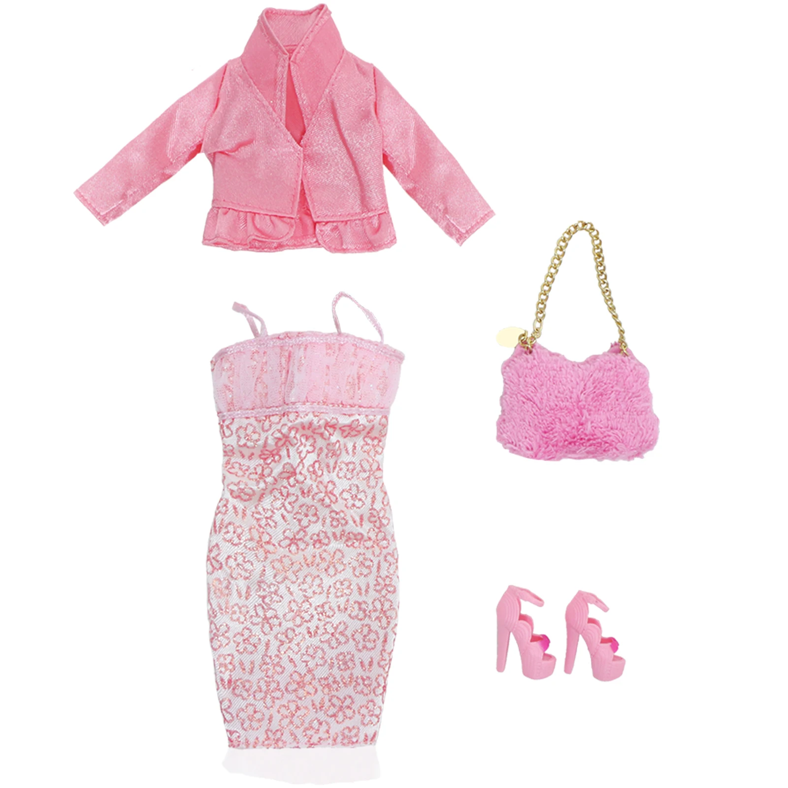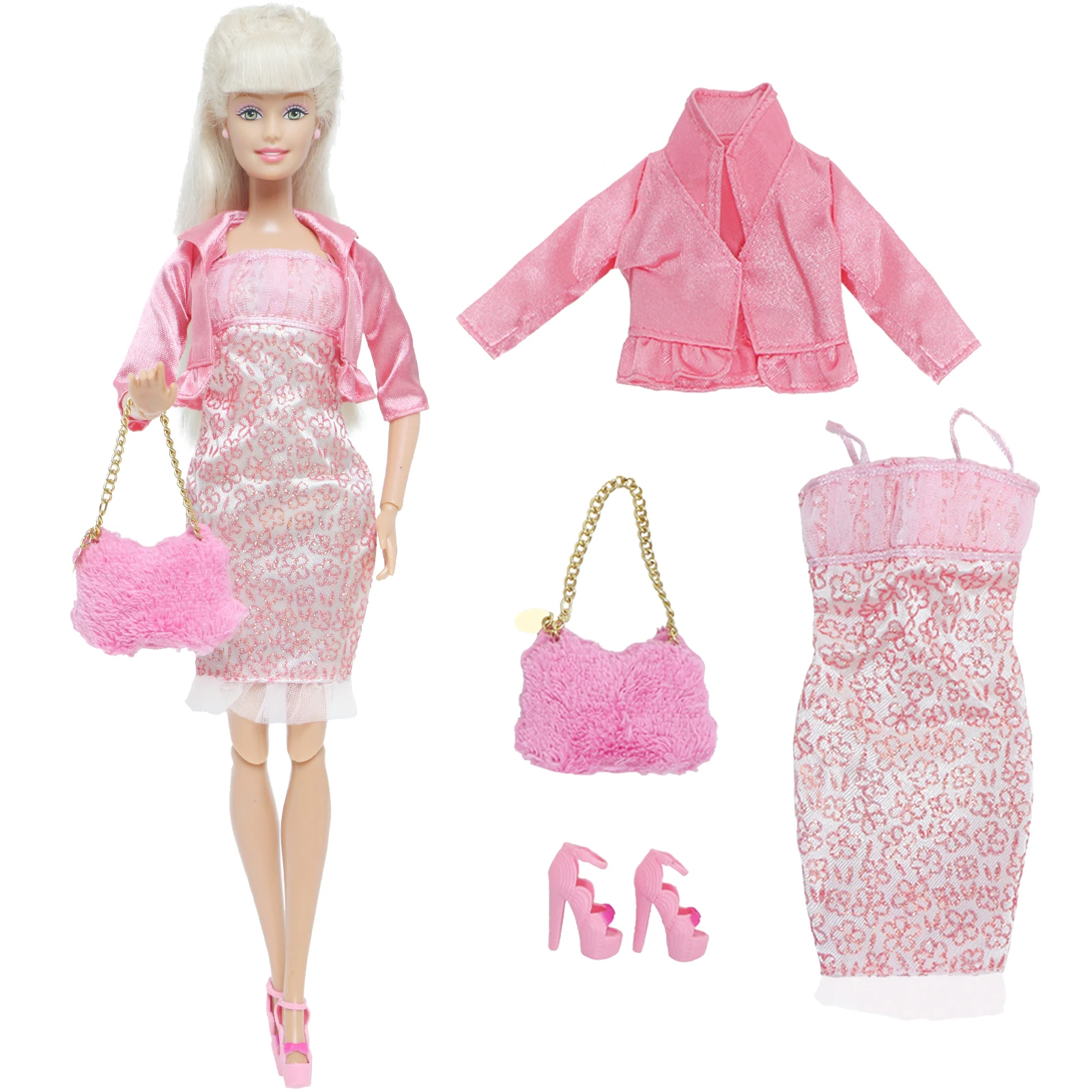 Платье для куклы Барби BJDBUS, розовый комплект одежды, мини-платье, обувь на высоком каблуке, сандалии, пальто, сумочка, аксессуары для кукол, детская игрушка