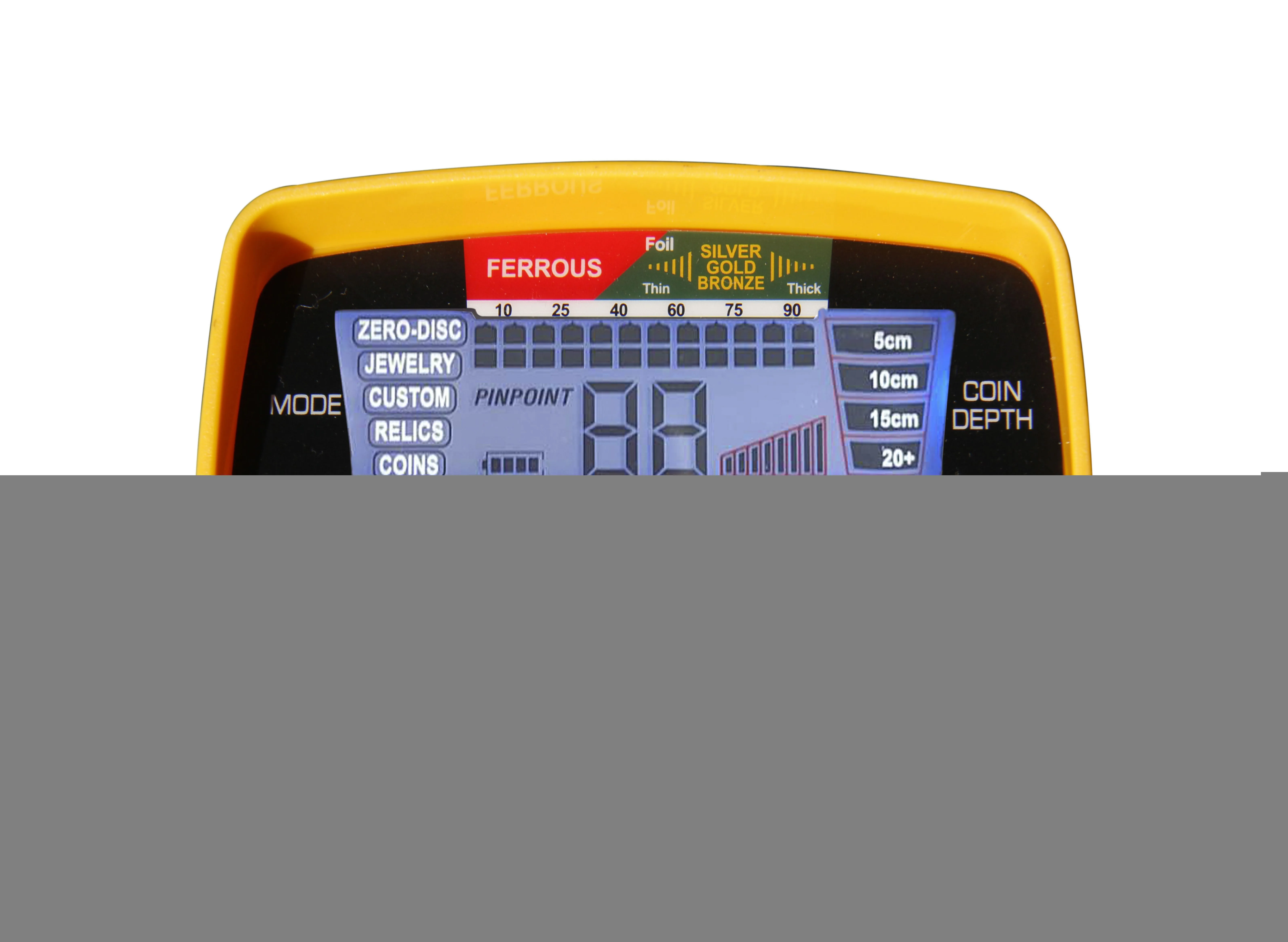 Режим-показывает, какой из пяти режимов обнаружения (ноль, ювелирные изделия, обычай, реликвии или монеты) был выбран путем выделения соответствующего слова на ЖК-экране.