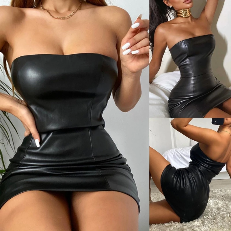 Женское сексуальное облегающее мини-платье из искусственной кожи, черное облегающее платье без рукавов и бретелек, облегающий топ с высокой талией