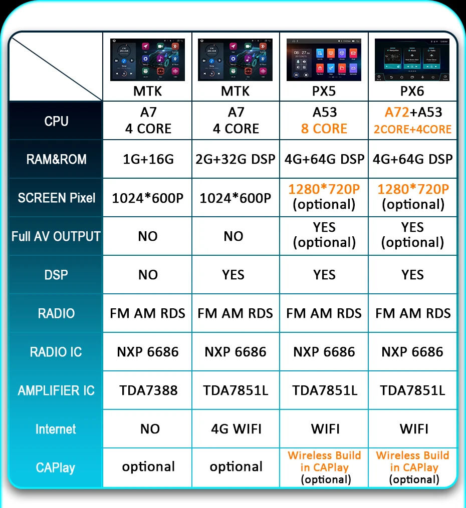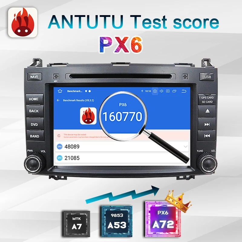 PX6PX6 является лучшим чипом на рынке в настоящее время, он работает быстрее, чем все другие типы. Балл ANTUTU составляет 160770, что лучше 7853 4G + 64G, PX5 и всех других типов 4 + 64G на рынке. По сравнению с другими радио типа fo, PX6 radio может загружать больше видов приложений android с android market, и приложение может работать лучше.