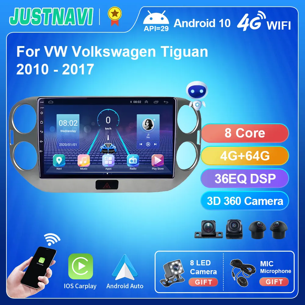 Автомобильный мультимедийный плеер JUSTNAVI, 10 дюймов, DSP, Android 10,0, Автомагнитола для VW Volkswagen Tiguan 2010-2017, навигатор, GPS, Wi-Fi, без DVD