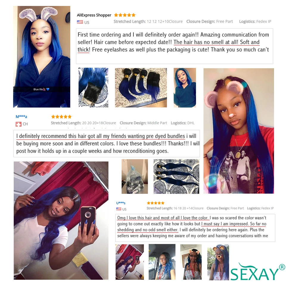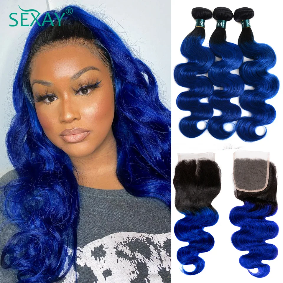 Волнистые пучки Sexay с фронтальной Реми, перуанские человеческие волосы для наращивания, 28 дюймов, 1B голубые пучки омбре с фронтальной